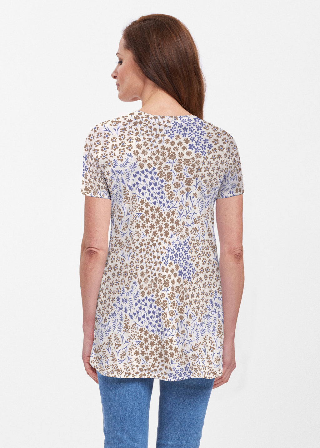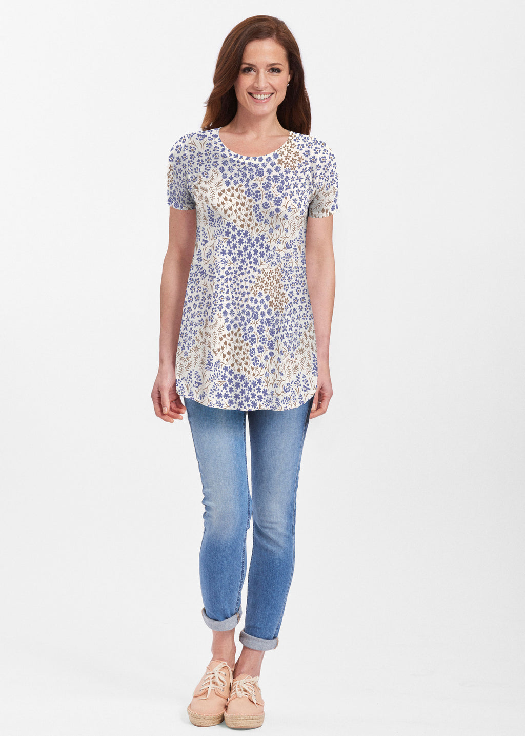 Our soft and feminine short sleeve silhouette tunic is sure to flatter any figure. Made in our Butterknit fabic that flows into a relaxed curved hem that is slightly longer in the back with subtle side slits.