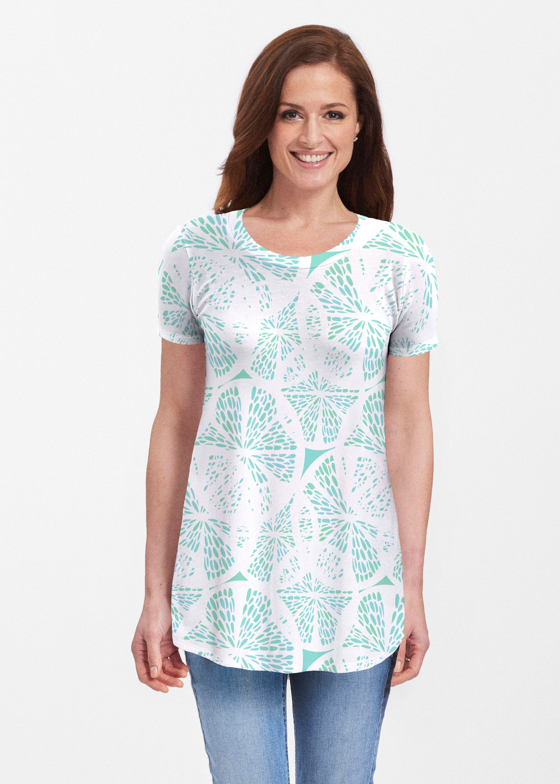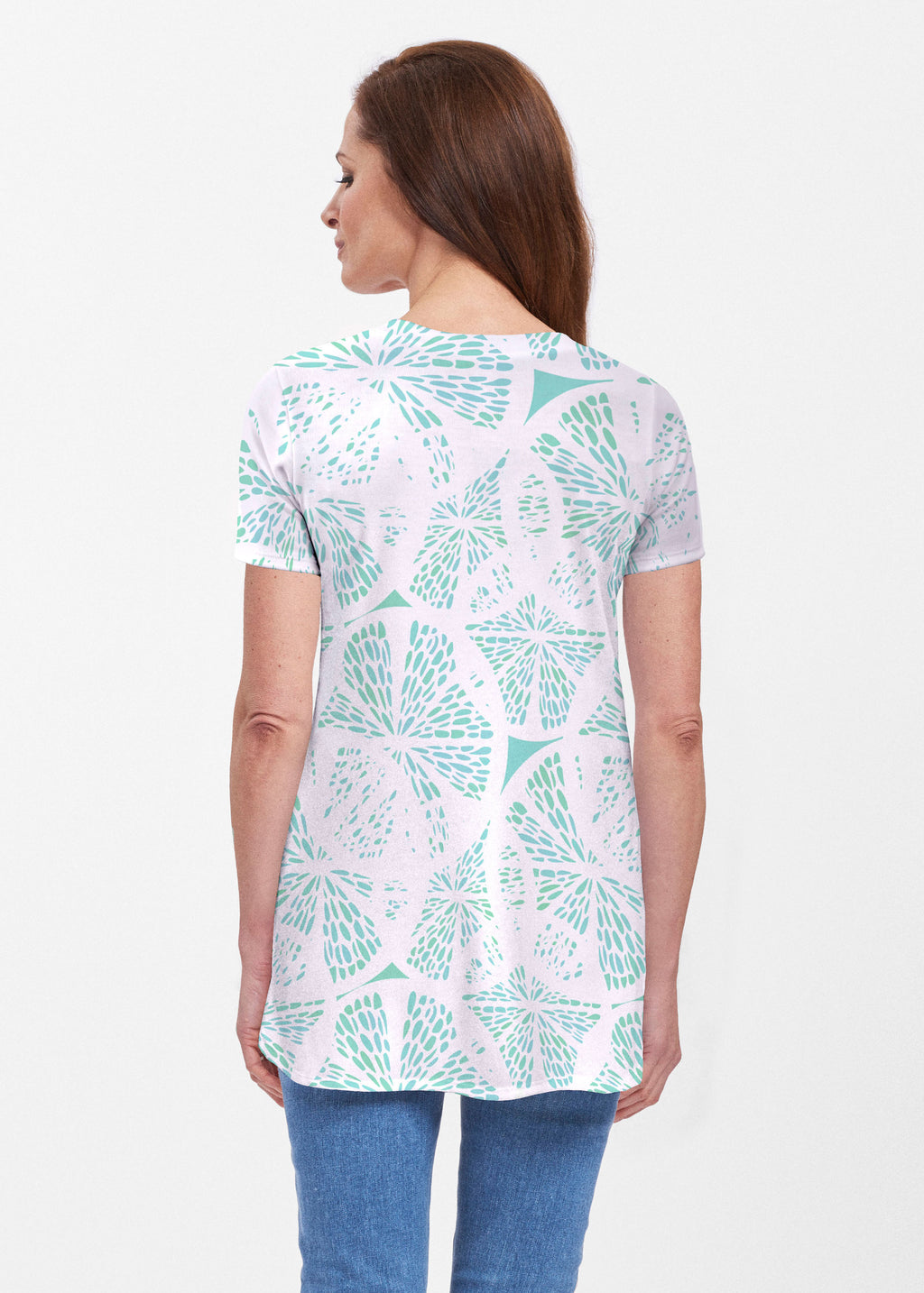 Our soft and feminine short sleeve silhouette tunic is sure to flatter any figure. Made in our Butterknit fabic that flows into a relaxed curved hem that is slightly longer in the back with subtle side slits.