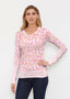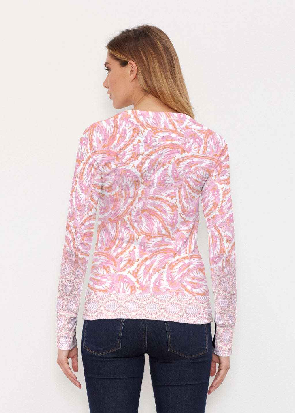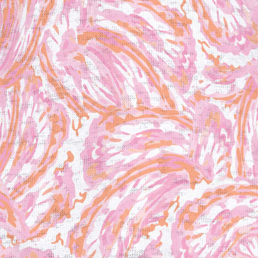 A fanciful paisley prints in coastal colors of pink and orange with contrasting hem and cuffs. Designed by Susan Werner.