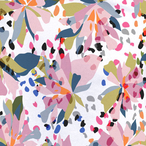 A bold burst of abstract florals and leopard spots in vibrant shades of purple, pink, blue, orange and green with more loosely patterned mixed sleeves. Designed by Susan Werner.