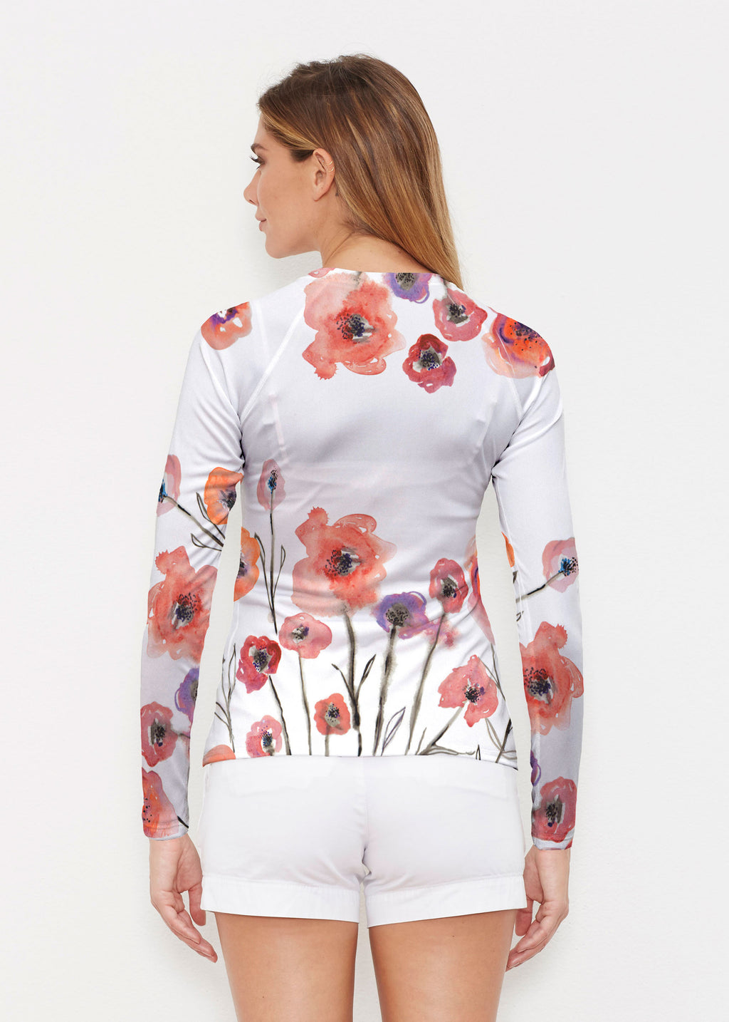 Our WHIMSY ROSE™ Safe Sun UPF 50+ long sleeve, crew neck rash guard offers versatile, beach-to-bistro style, supreme comfort, and an activewear fit. Made in a specially designed Safe Sun textile that blocks more harmful rays and provides a smart solution for those who love to swim, surf, kayak, canoe, waterski, boat, or simply relax waterside.