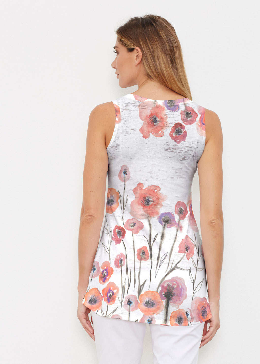 This tank is the perfect combination of an elegant shape with a sporty look. A high-low cascading hemline falls loosely over the hip in our Signature burnout fabric. No sleeves and a shallow scoop neckline give this tank its sporty vibe. -- Your one-of-a-kind garment is created using all-over soft garment sublimation printing. Selected designs are individually printed into your garment. Cotton/Polyester blend.