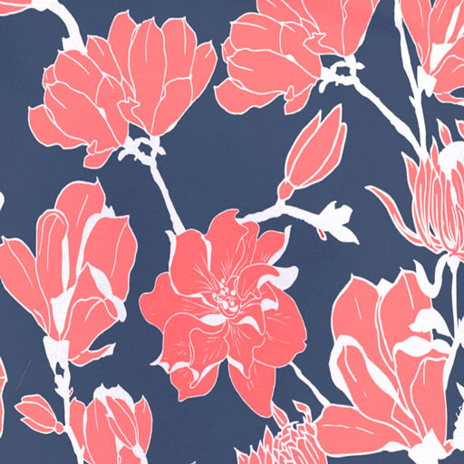 A beautiful mixed navy print of red blooming magnolias on the front and sleeves with a captivating beaded pattern on the back. Designed by Susan Werner.