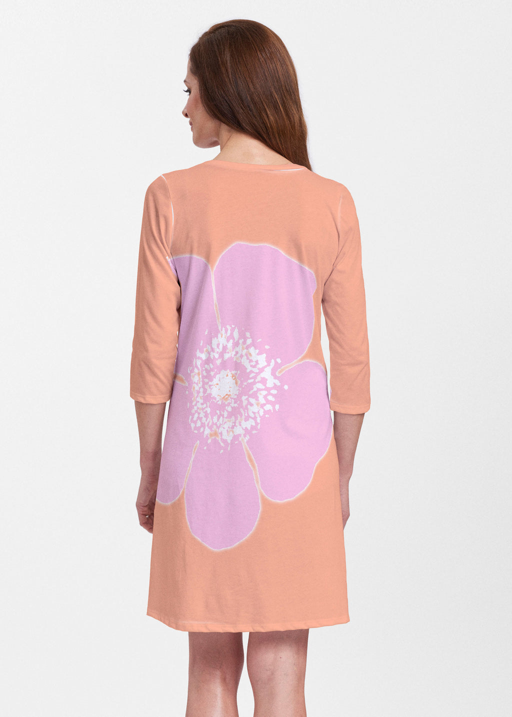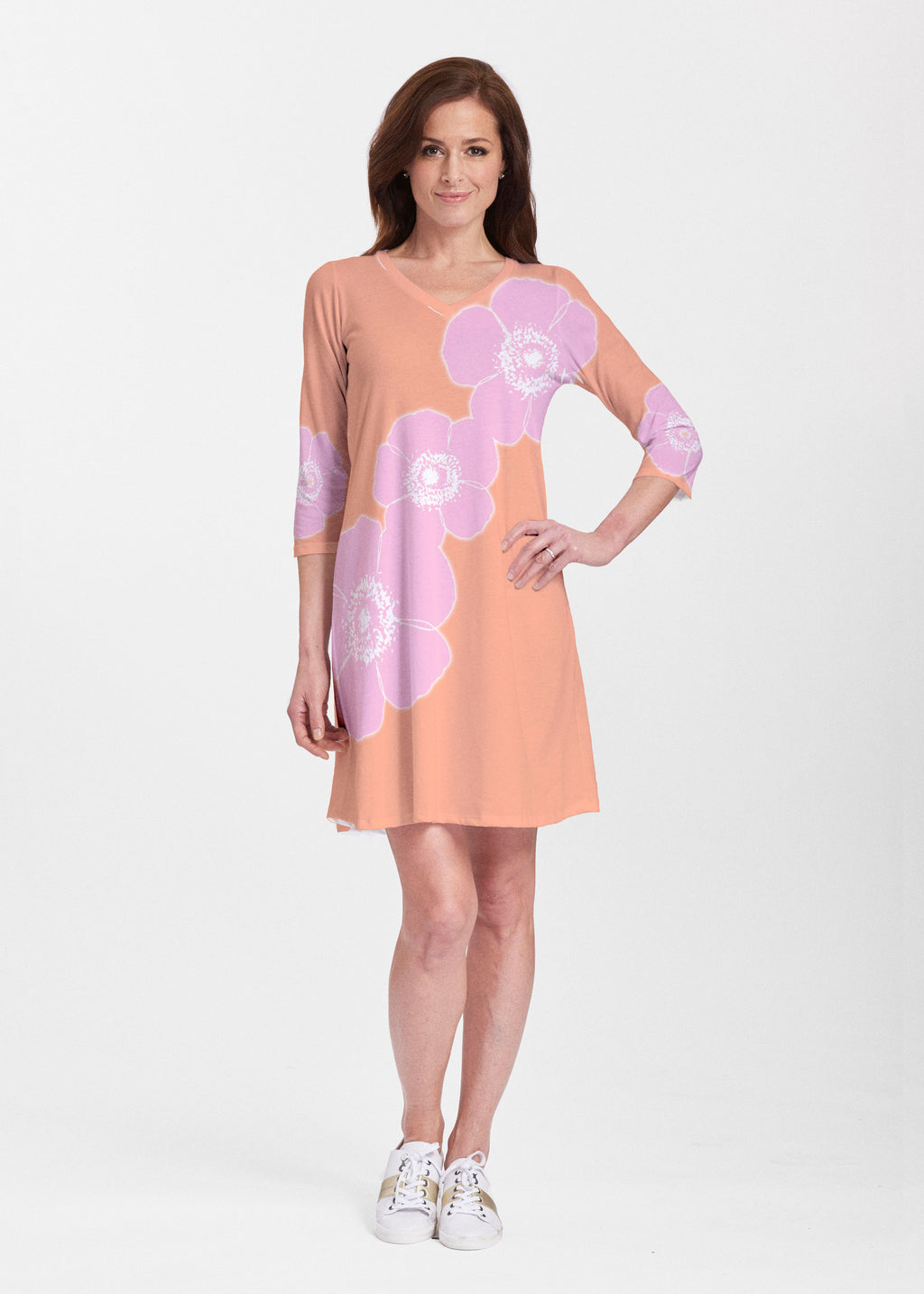 A relaxed swing silhouette with 3/4 sleeves and v-neck make up the newest addition to our Classic dress collection. Hem falls just above the knee.