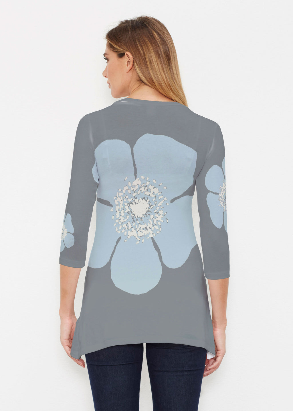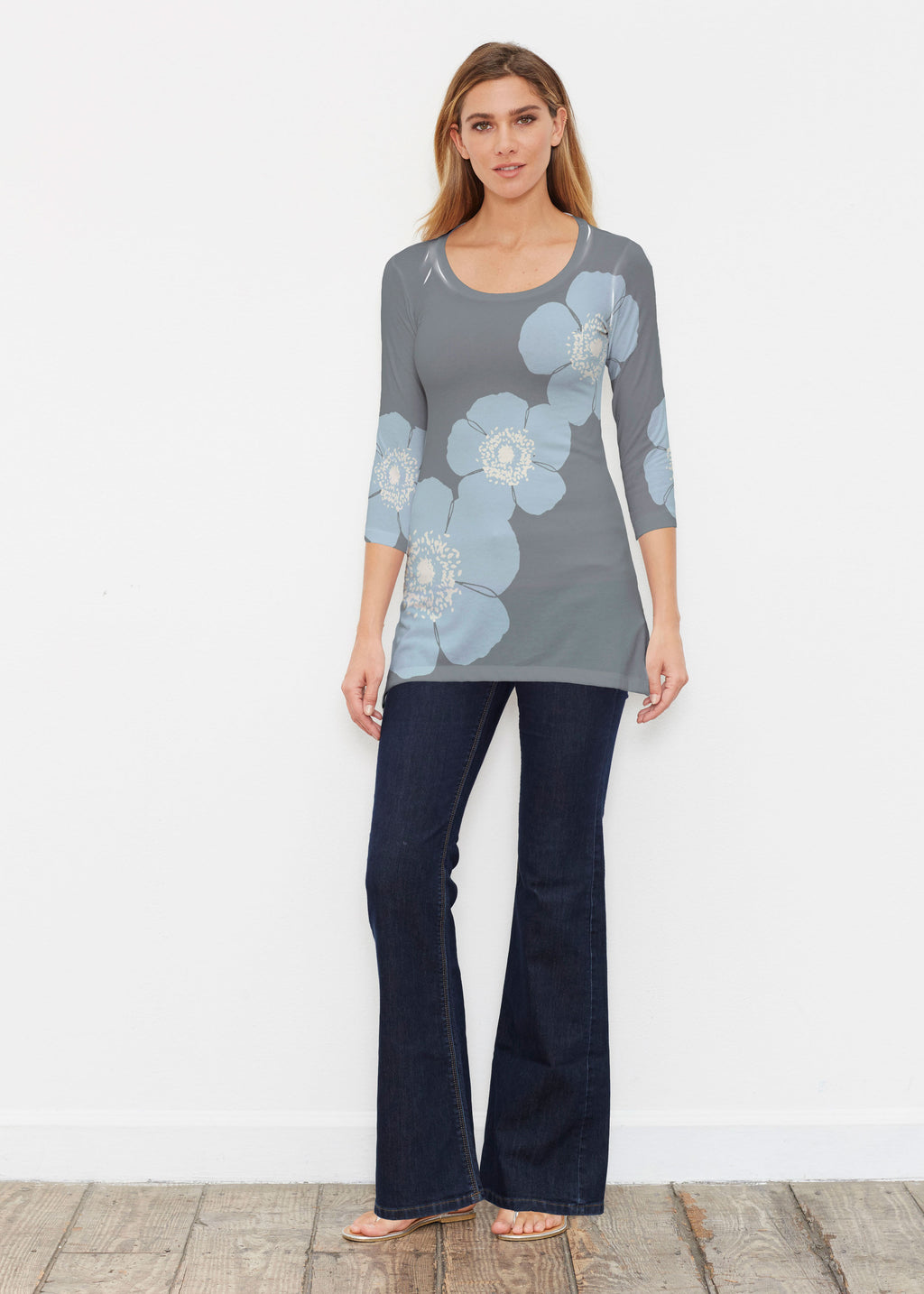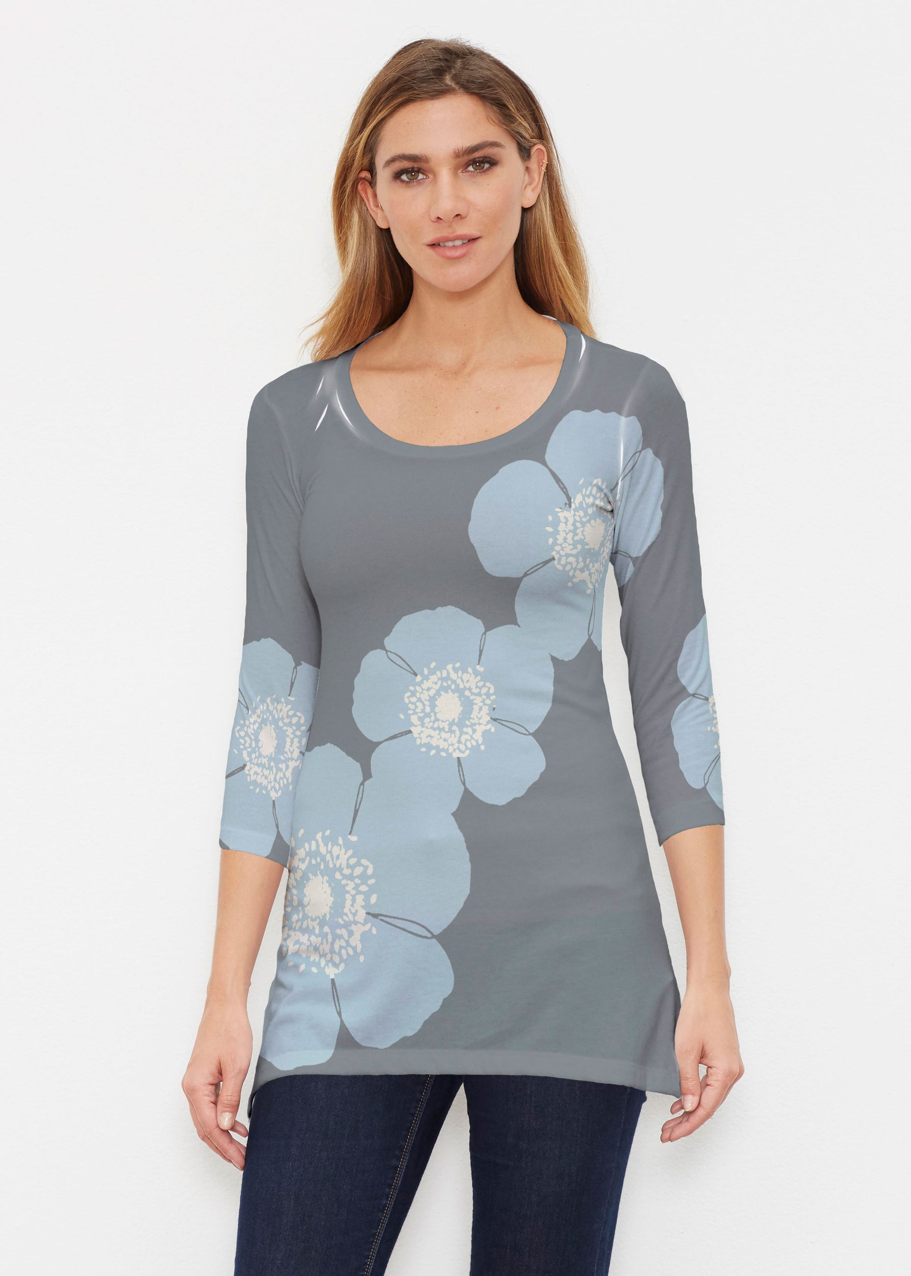 Surprising comfort and style combine in our luxurious Buttersoft blend. A delicate scoop neck, 3/4 sleeve, sweeping curved hemline falls just below the hip.