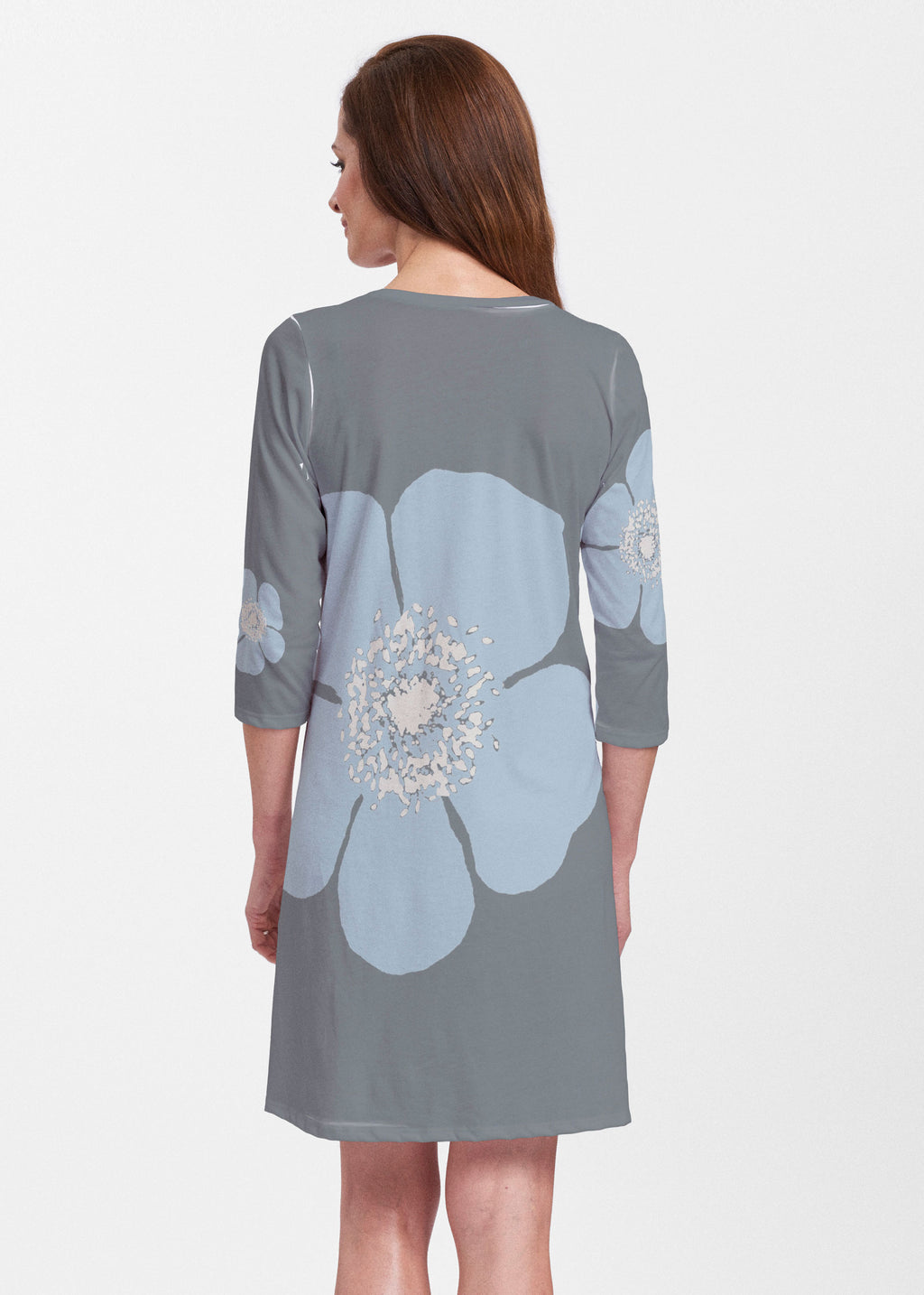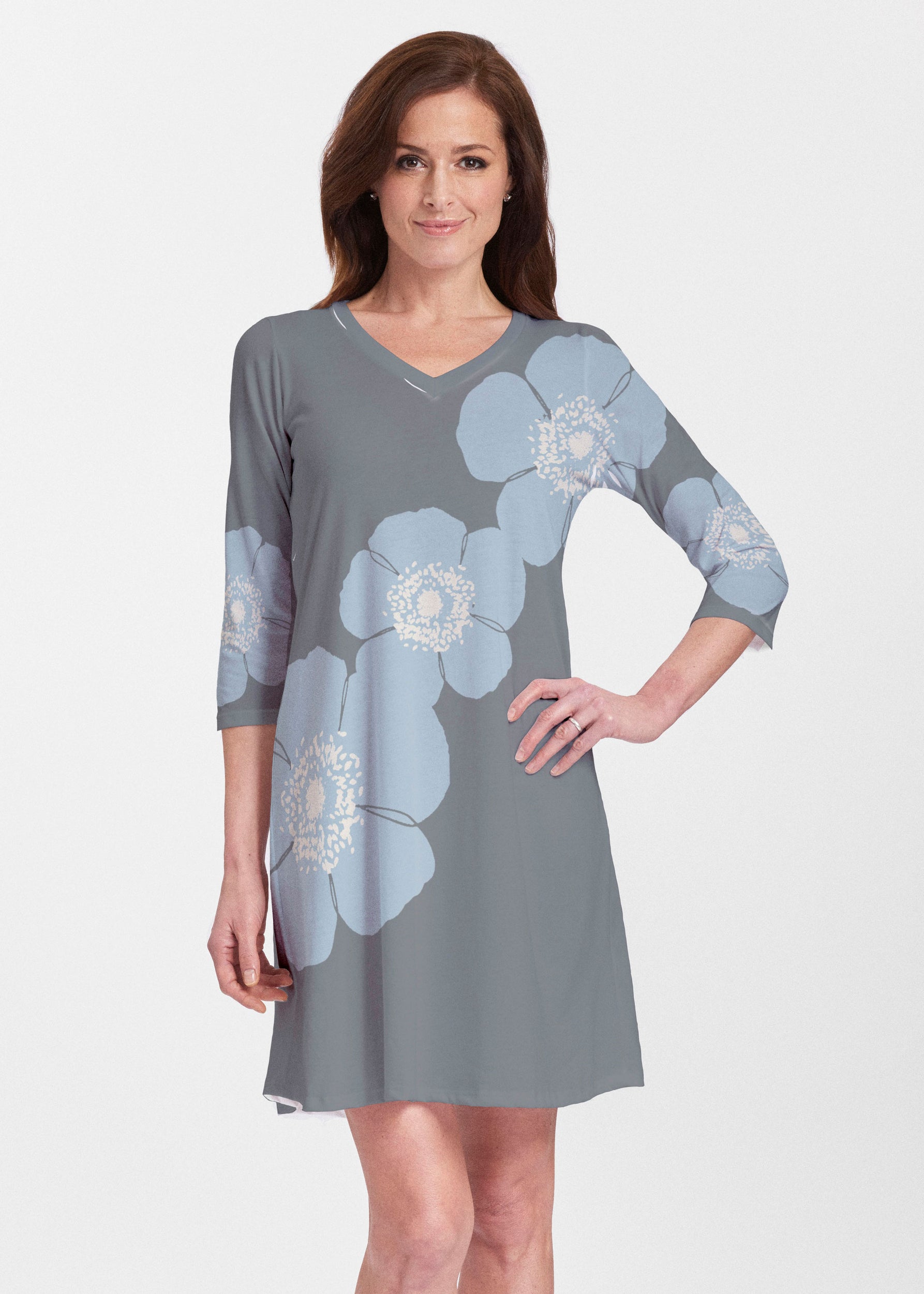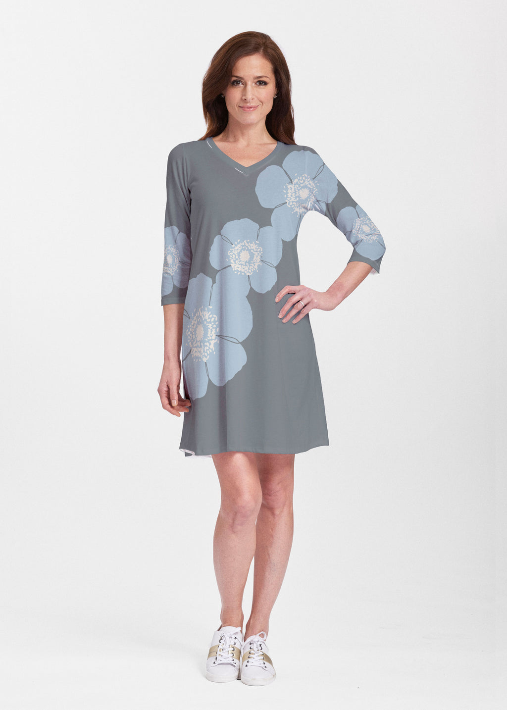 A relaxed swing silhouette with 3/4 sleeves and v-neck make up the newest addition to our Classic dress collection. Hem falls just above the knee.