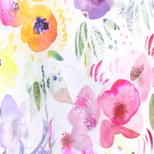 A bold and stunning watercolor of blossoms that captures the beautiful revitalization of Spring in shades of pink, green purple and orange. Designed by Debra Valencia.