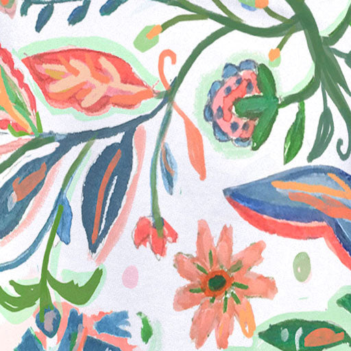 A stunning and playful floral print in coral, aqua, blue and green, designed by Jeanetta Gonzales.