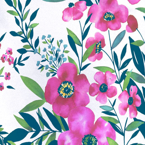 A stunning and romantic pink floral print with foliage and accent florals with contrasting dot pattern on the sleeve. Designed by Diane Kappa.