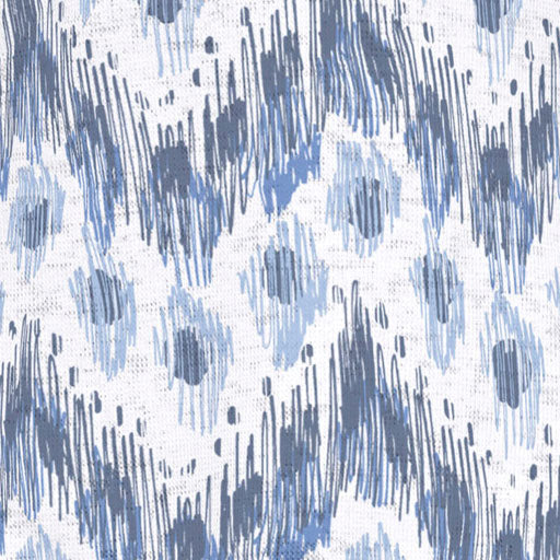 Intricate hatched lines form abstract ikat patterns that flow in a visually striking chevron design in cool shades of navy, cobalt blue and aqua. Designed by Susan Werner.