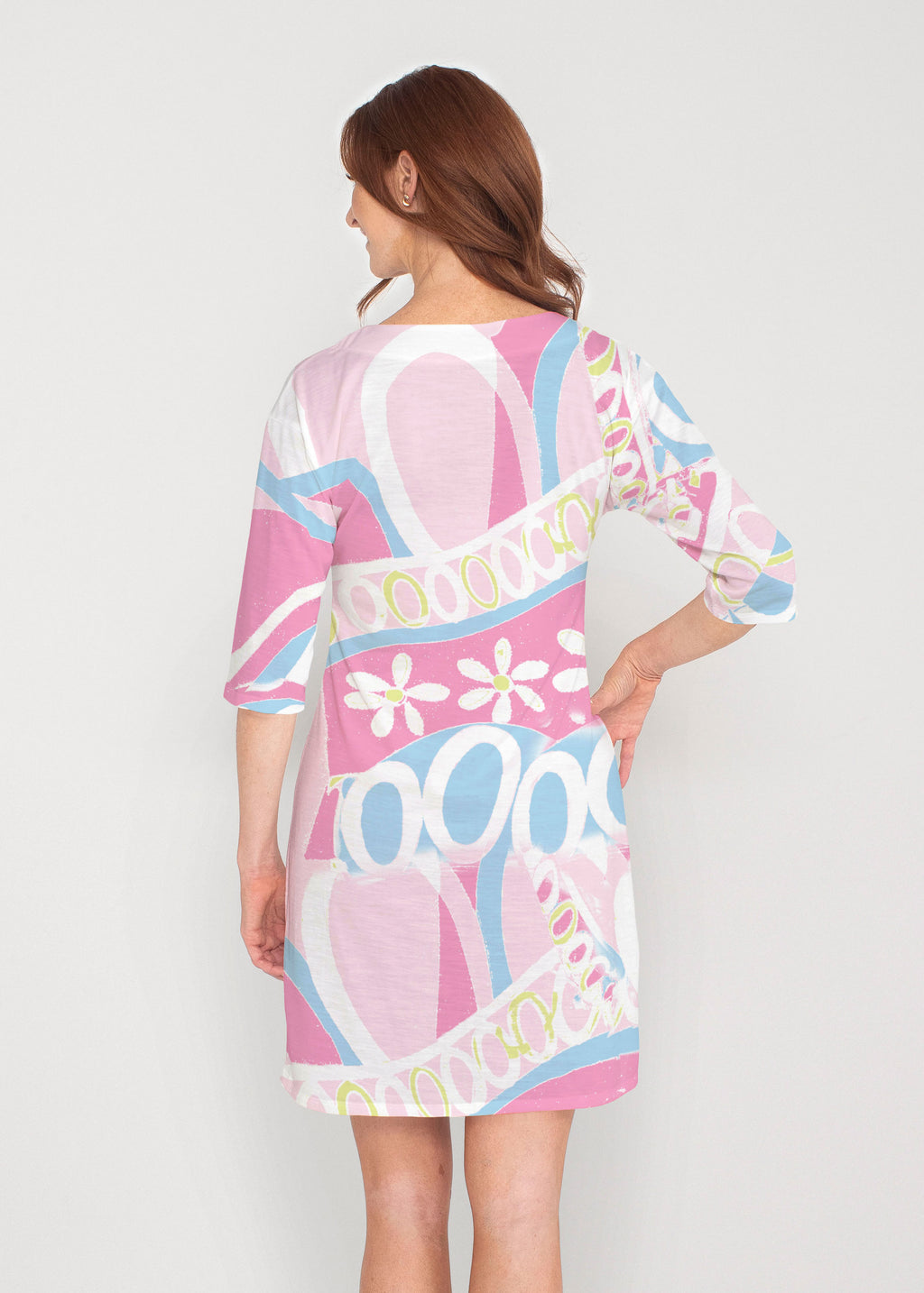 Be comfortable and fashionable all day in our light weight french terry fabric. This v-neck dress features loose 3/4 sleeves, drop shoulders and falls just at the knee.