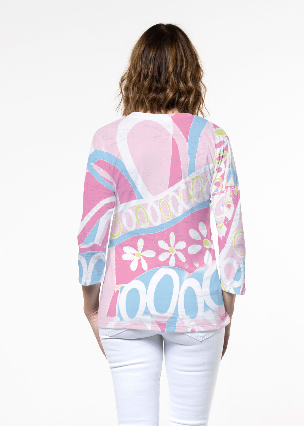 A vibrant and nostalgic 70s-inspired geoprint design that captures the essence of summertime. The playful combination of pinks and aquas creates a lively and refreshing color palette, reminiscent of clear skies and tropical waters.