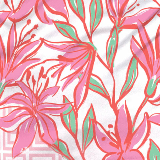 A vibrant portrayal of red & pink lillies amongst a pale pink geo background.