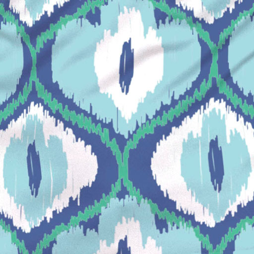 A playful ikat print in shades of blues with green and white and a back panel of our "bud" print in aqua and white.