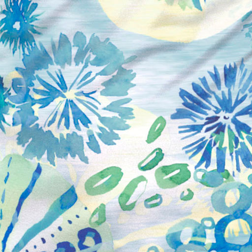 A beachy feel print of aquas and yellow flowers with hints of sand dollars on a vibrant background.