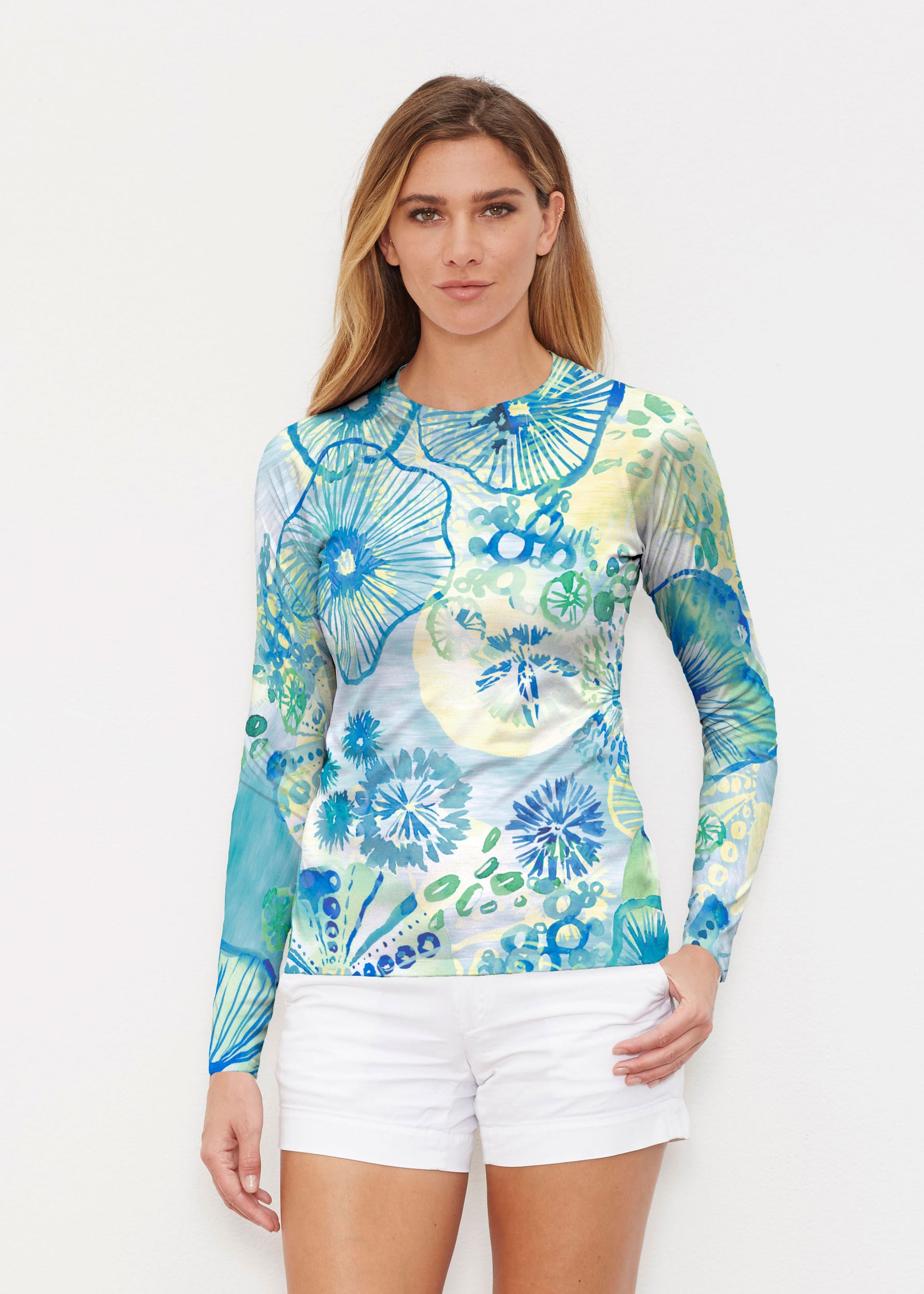 Our WHIMSY ROSE™ Safe Sun UPF 50+ long sleeve, crew neck rash guard offers versatile, beach-to-bistro style, supreme comfort, and an activewear fit. Made in a specially designed Safe Sun textile that blocks more harmful rays and provides a smart solution for those who love to swim, surf, kayak, canoe, waterski, boat, or simply relax waterside.