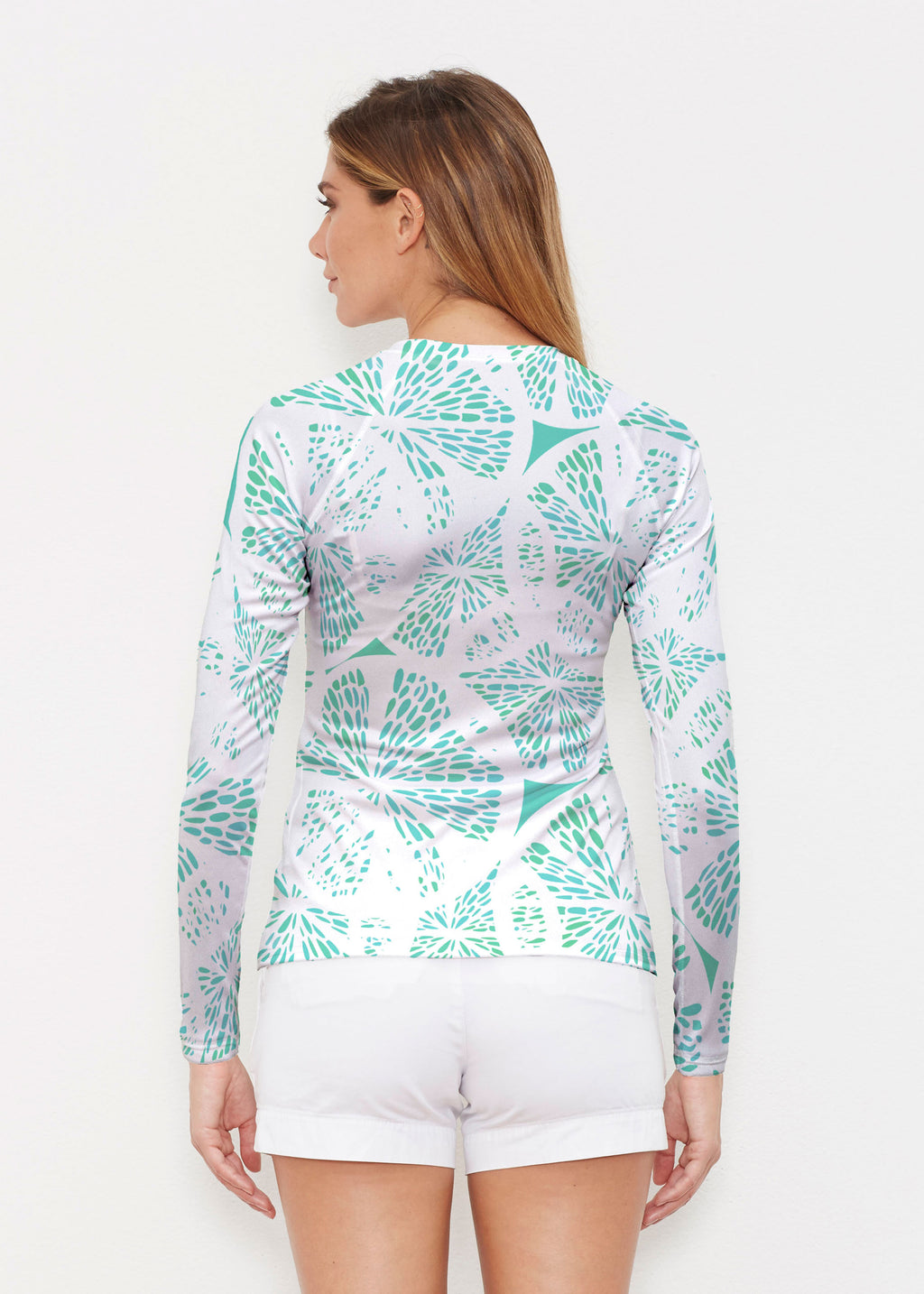 Our WHIMSY ROSE™ Safe Sun UPF 50+ long sleeve, crew neck rash guard offers versatile, beach-to-bistro style, supreme comfort, and an activewear fit. Made in a specially designed Safe Sun textile that blocks more harmful rays and provides a smart solution for those who love to swim, surf, kayak, canoe, waterski, boat, or simply relax waterside.