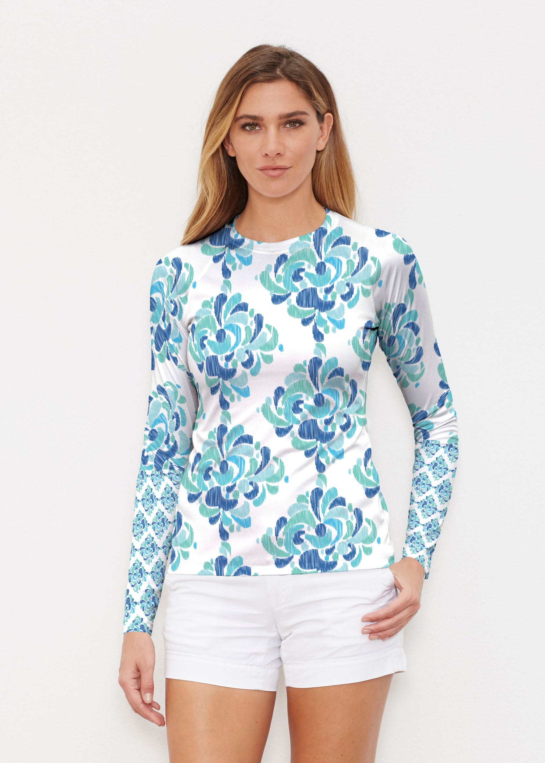 Our WHIMSY ROSE™ Safe Sun UPF 50+ long sleeve, crew neck rash guard offers versatile, beach-to-bistro style, supreme comfort, and an activewear fit. Made in a specially designed Safe Sun textile that blocks more harmful rays and provides a smart solution for those who love to swim, surf, kayak, canoe, waterski, boat, or simply relax waterside.