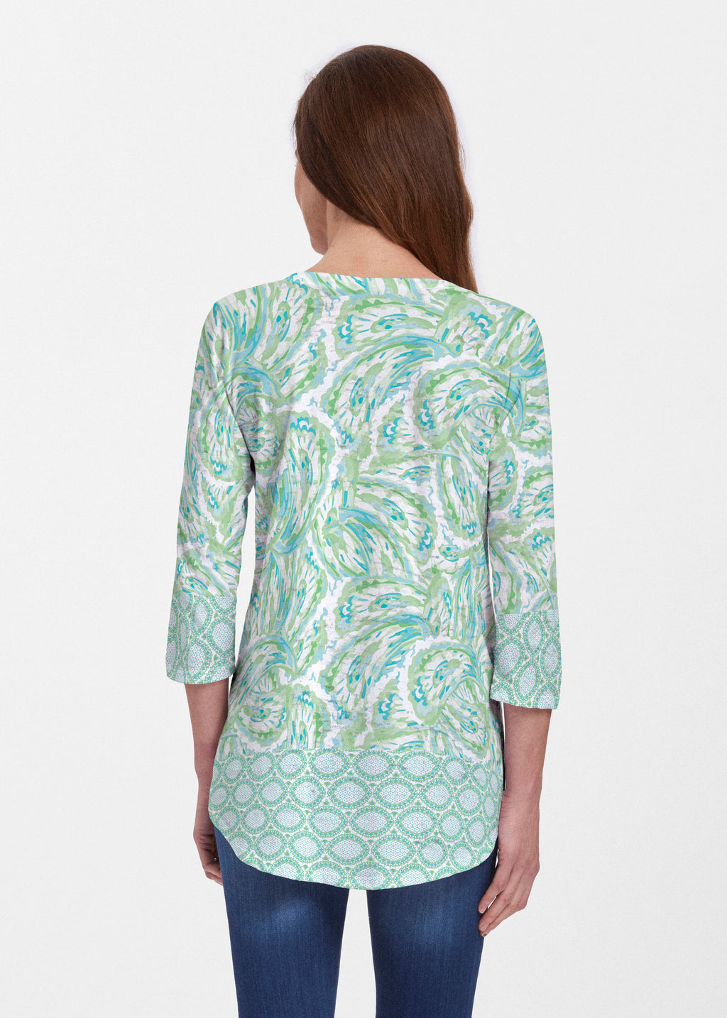 A fanciful paisley prints in coastal colors of green and blue with contrasting hem and cuffs. Designed by Susan Werner.