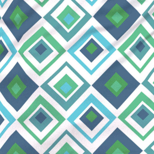 A simple yet sophisticated geometric print with playful diamond shapes of aqua, navy and green designed by Susan Werner.