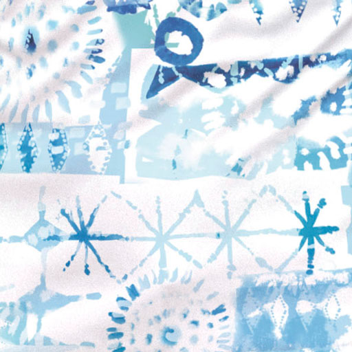 A whimsical geometric print in different hues of blue and white designed by Sara Berrenson.