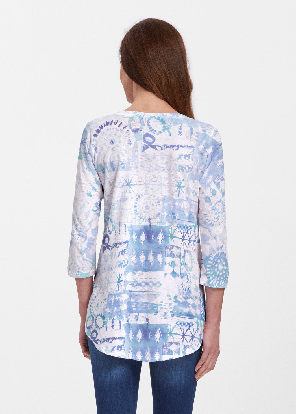 This v-neck tunic in our Signature burnout fabric is forever flattering. 3/4 sleeves and a v-neck flow into a full, swinging shirttail hem.