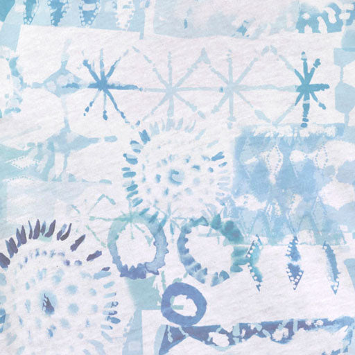 A whimsical geometric print in different hues of blue and white designed by Sara Berrenson.