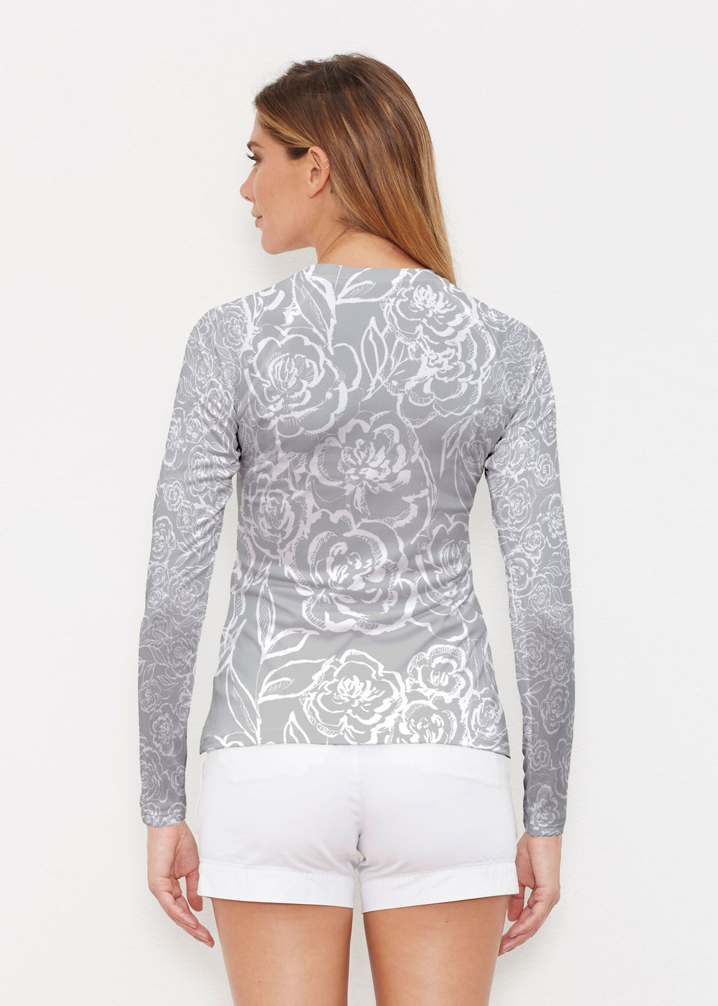 Our WHIMSY ROSE™ Safe Sun UPF 50+ long sleeve, crew neck rash guard offers versatile, beach-to-bistro style, supreme comfort, and an activewear fit. Made in a specially designed Safe Sun textile that blocks more harmful rays and provides a smart solution for those who love to swim, surf, kayak, canoe, waterski, boat, or simply relax waterside.