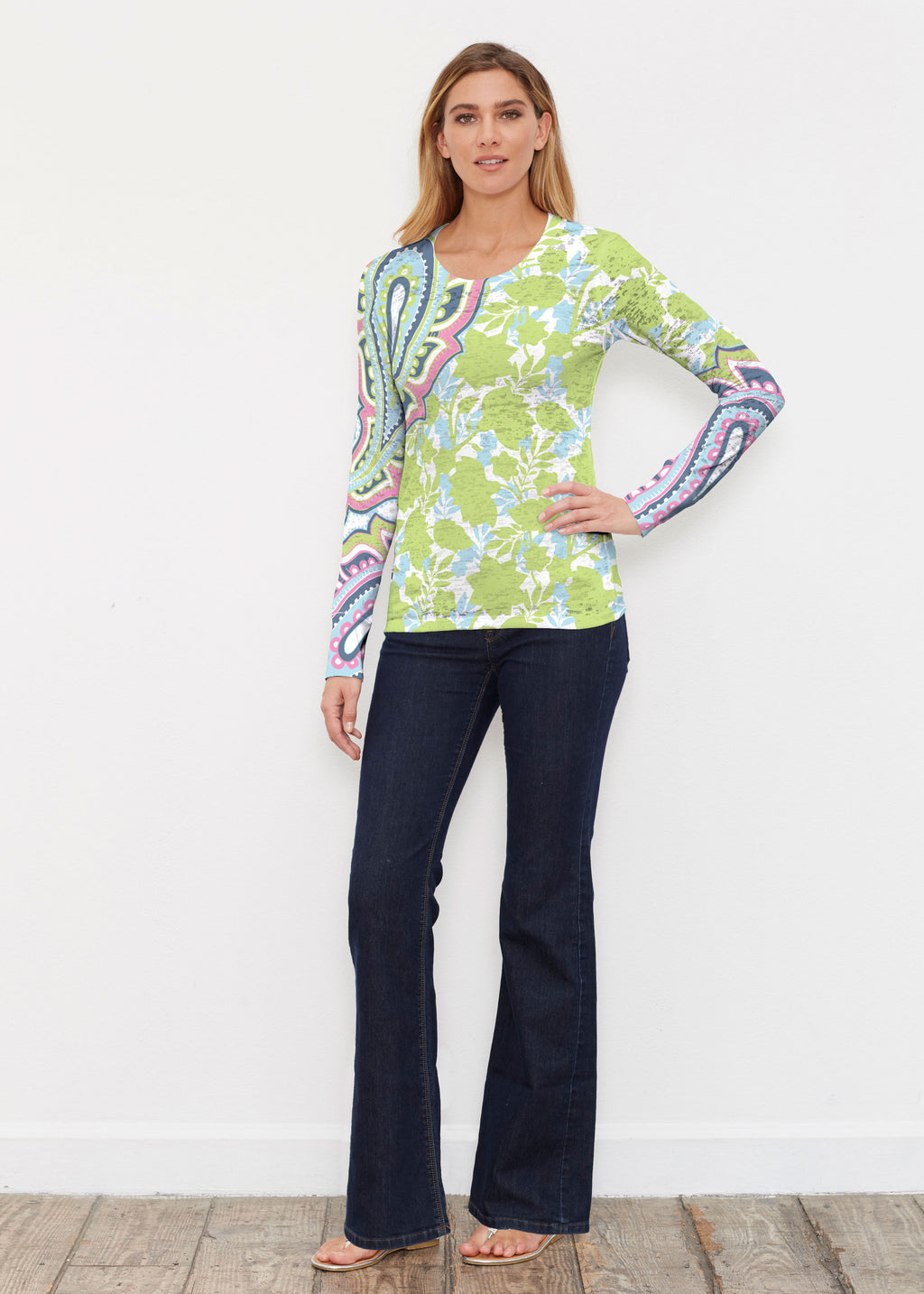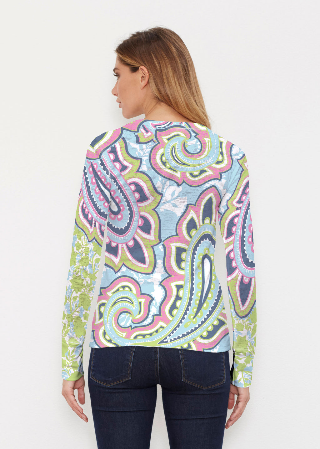 Brilliant lime green, aqua, pink and navy blue paisley design with contrasting front and back vivid floral print, designed by Diane Kappa.