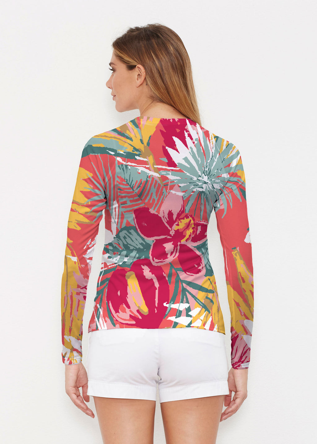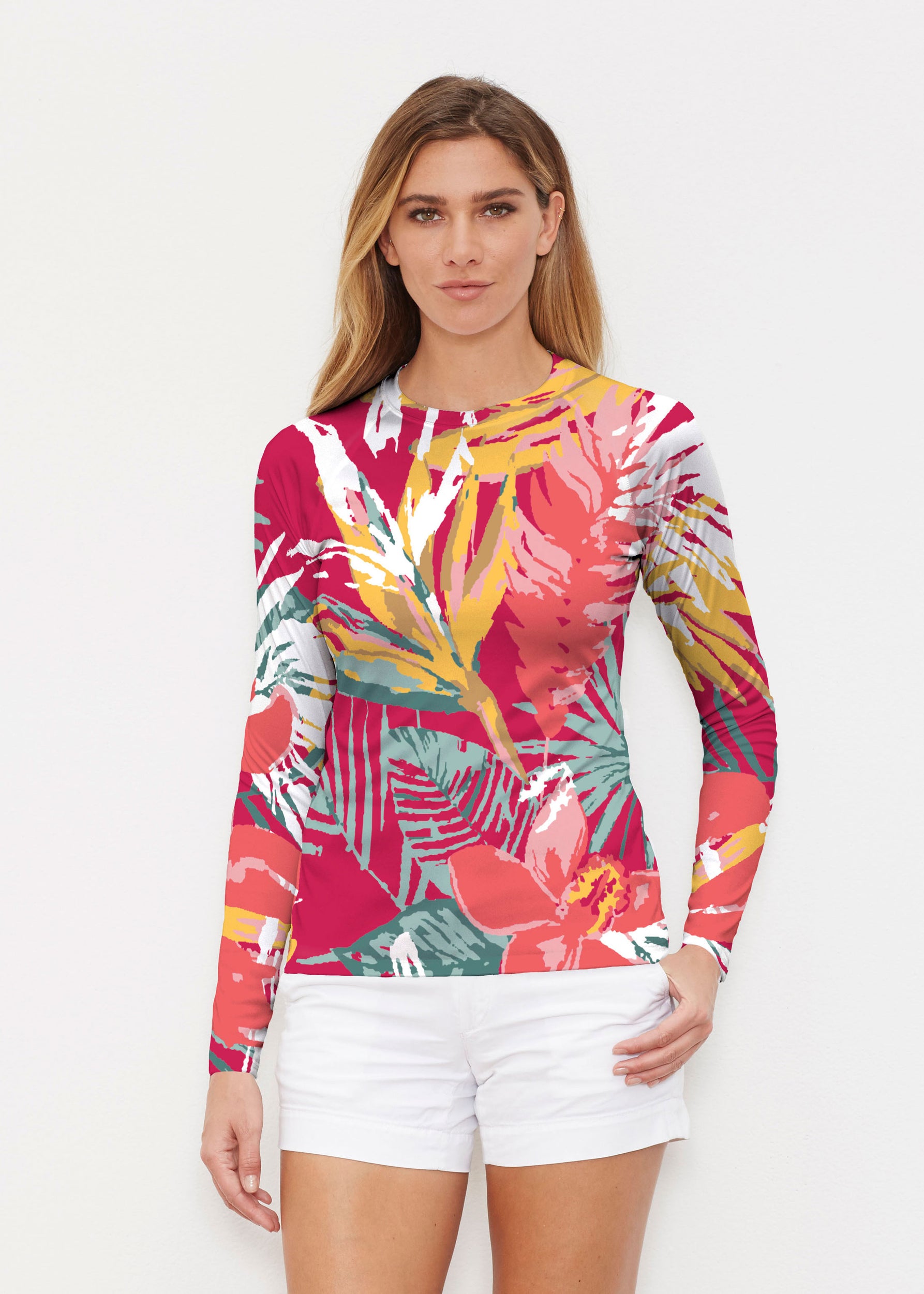 Our WHIMSY ROSE™ Safe Sun UPF 50+ long sleeve, crew neck rash guard offers versatile, beach-to-bistro style, supreme comfort, and an activewear fit. Made in a specially designed Safe Sun textile that blocks more harmful rays and provides a smart solution for those who love to swim, surf, kayak, canoe, waterski, boat, or simply relax waterside.