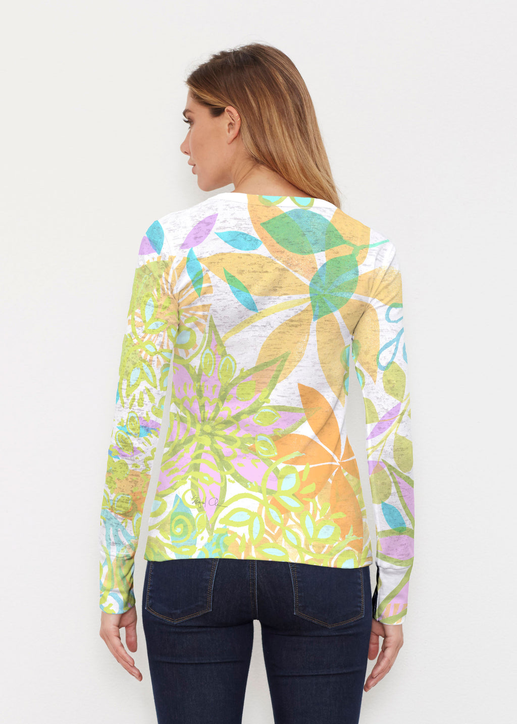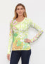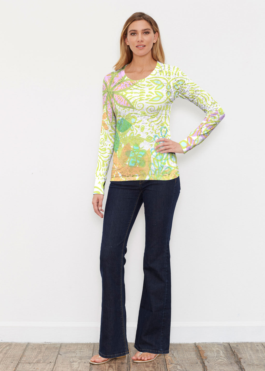 Fanciful lime green floral print with orange, purple and aqua designed by Sigrid Olsen.