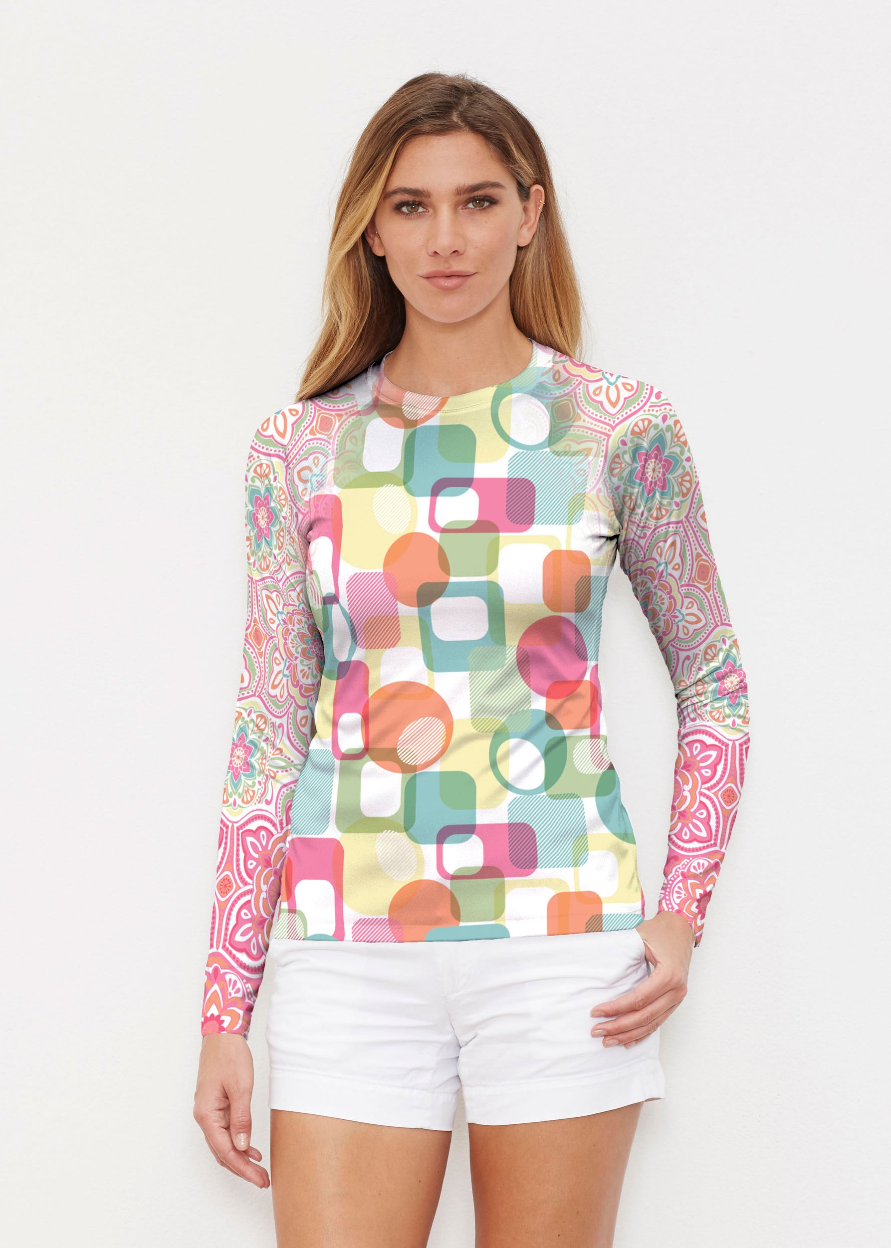 Our WHIMSY ROSE™ Safe Sun UPF 50+ long sleeve, crew neck rash guard offers versatile, beach-to-bistro style, supreme comfort, and an activewear fit. Made in a specially designed Safe Sun textile that blocks more harmful rays and provides a smart solution for those who love to swim, surf, kayak, canoe, waterski, boat, or simply relax waterside.