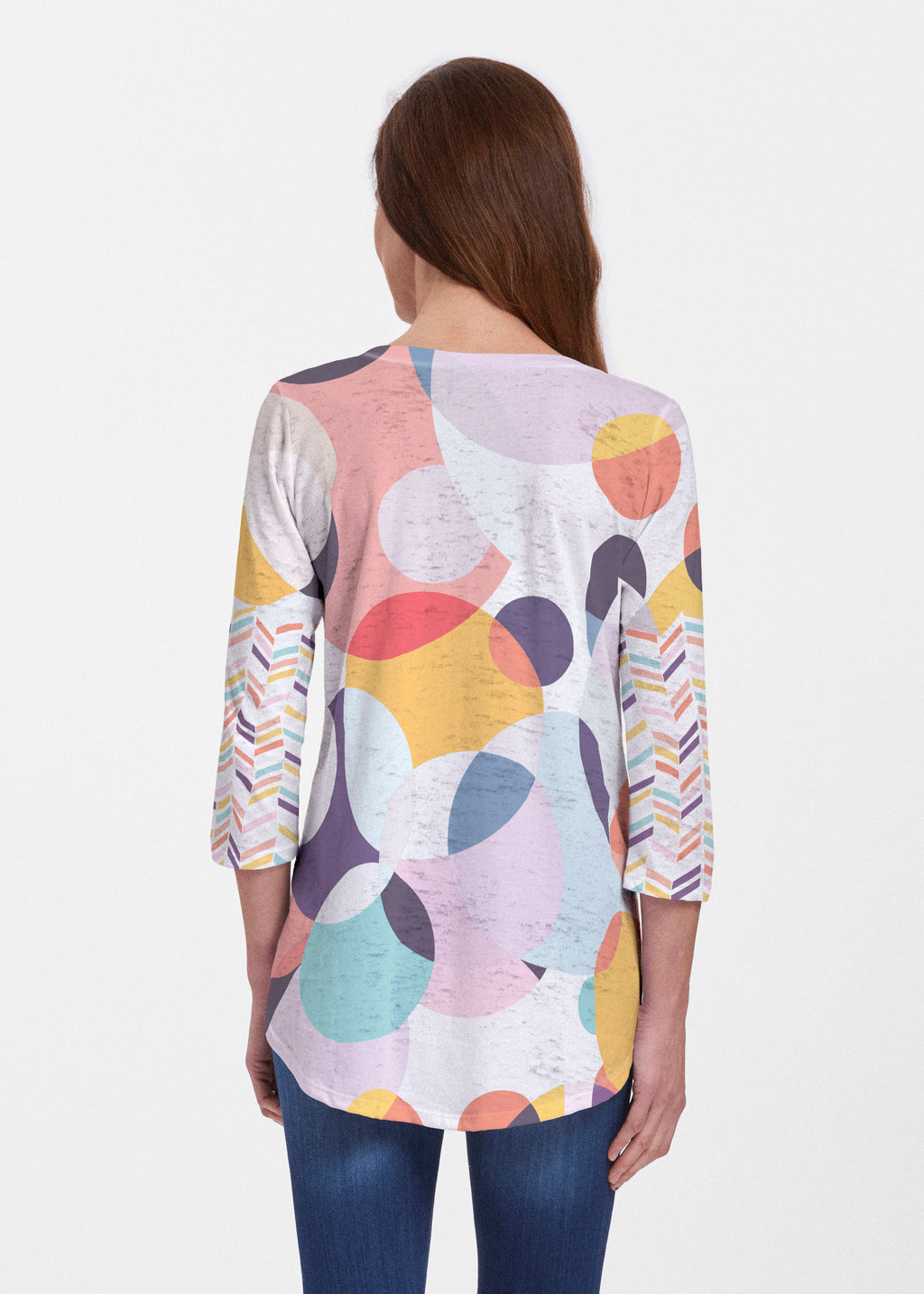 A fun and playful print with bright circles accented with a chevron striped sleeve, designed by Susan Werner.