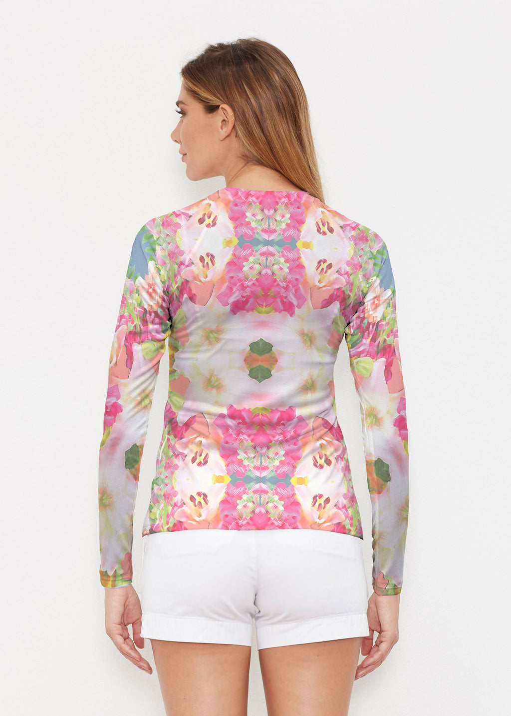 Our WHIMSY ROSE™ Safe Sun UPF 50+ long sleeve, crew neck rash guard offers versatile, beach-to-bistro style, supreme comfort, and an activewear fit. Made in a specially designed Safe Sun textile that blocks more harmful rays and provides a smart solution for those who love to swim, surf, kayak, canoe, waterski, boat, or simply relax waterside.