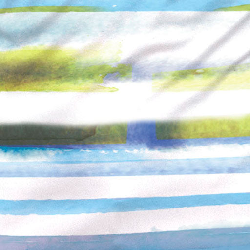 A fun and vibrant print with watercolor stripes of shades of blue, green and aqua, designed by Susan Werner.