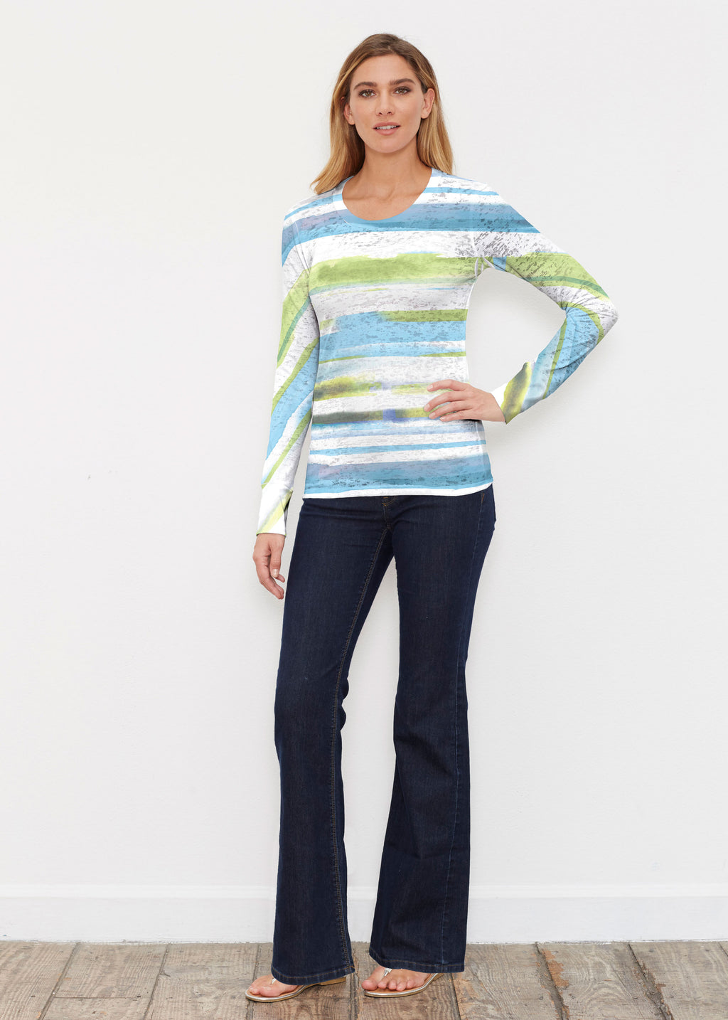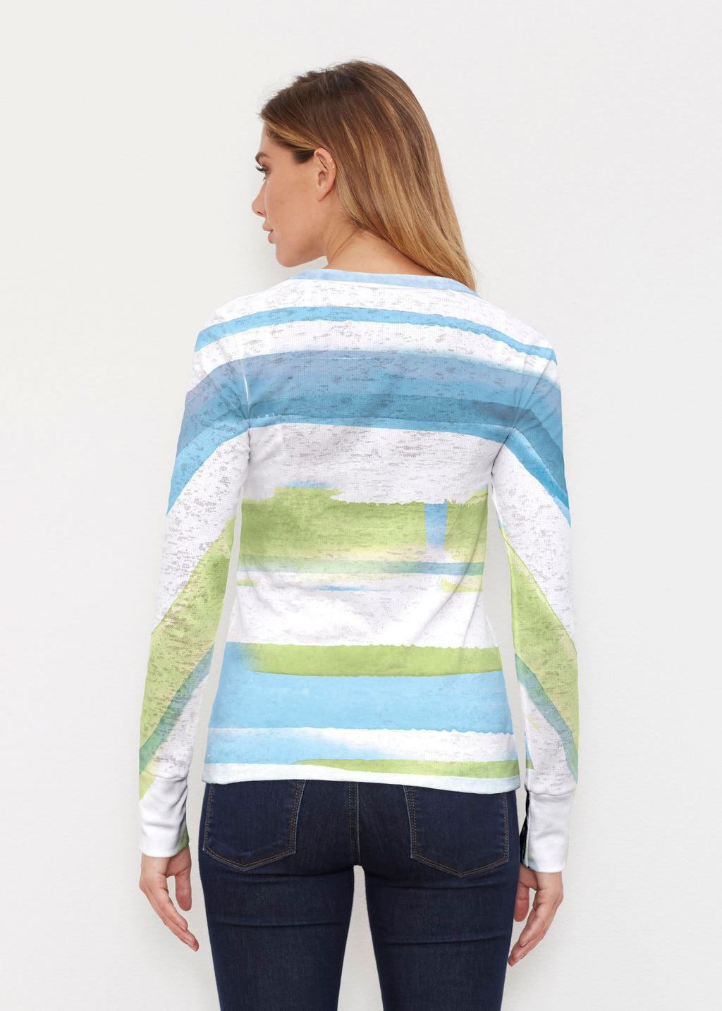 A fun and vibrant print with watercolor stripes of shades of blue, green and aqua, designed by Susan Werner.