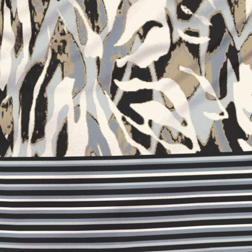 A mix of beige, grey, black and cream in abstract patterns of foliage designed by Carolyn McNeil.