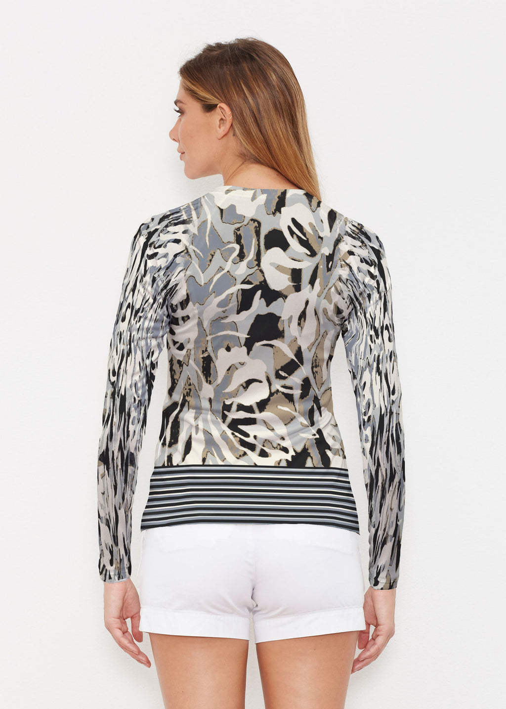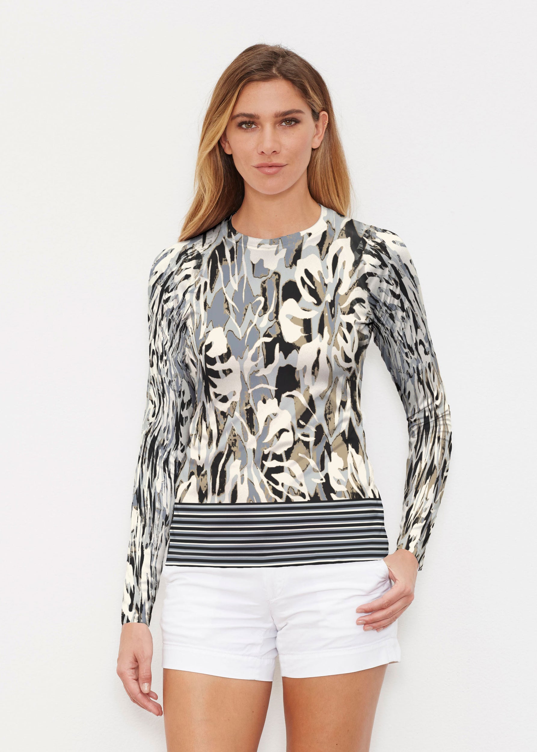 Our WHIMSY ROSE™ Safe Sun UPF 50+ long sleeve, crew neck rash guard offers versatile, beach-to-bistro style, supreme comfort, and an activewear fit. Made in a specially designed Safe Sun textile that blocks more harmful rays and provides a smart solution for those who love to swim, surf, kayak, canoe, waterski, boat, or simply relax waterside.