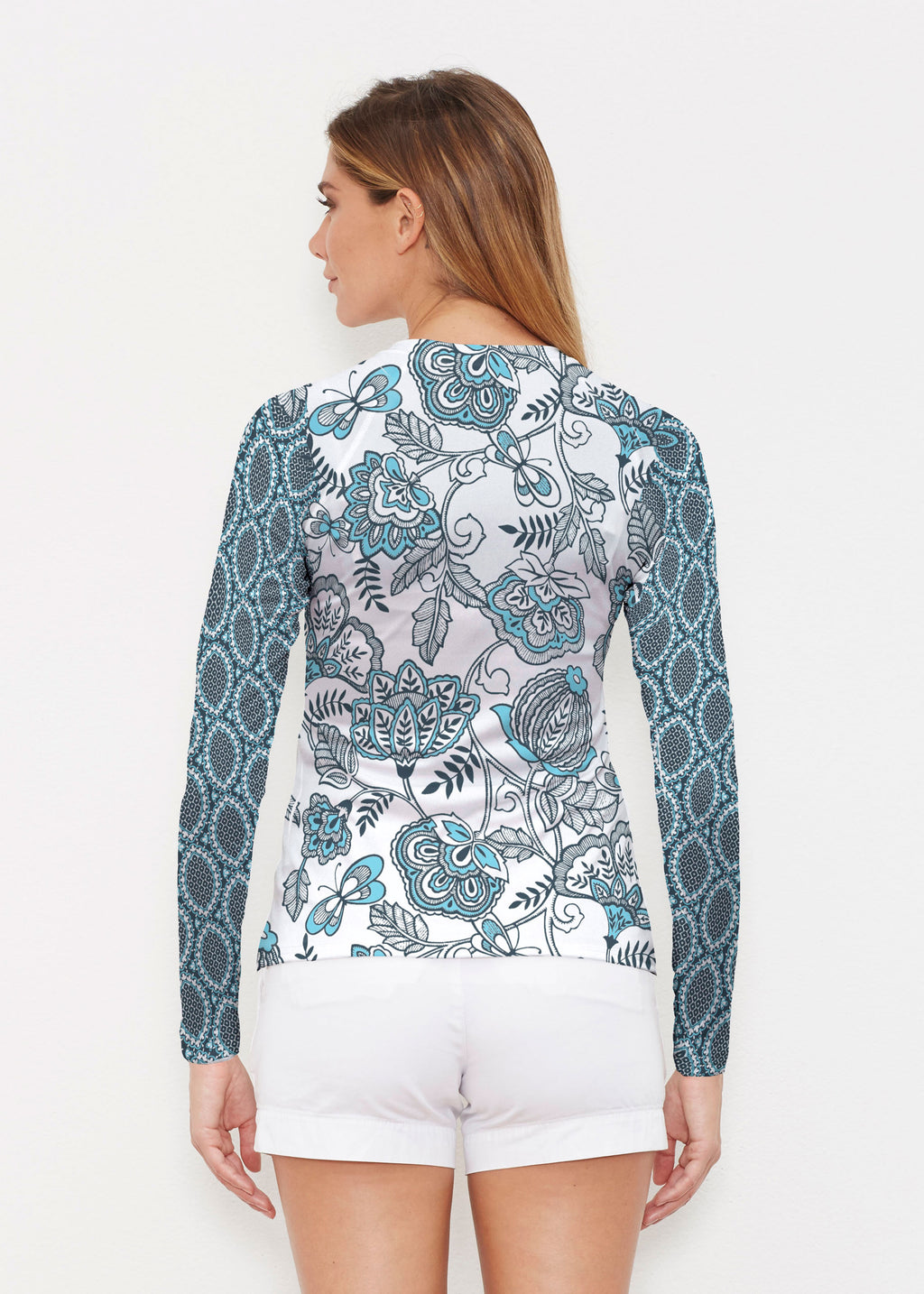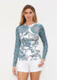Our WHIMSY ROSE™ Safe Sun UPF 50+ long sleeve, crew neck rash guard offers versatile, beach-to-bistro style, supreme comfort, and an activewear fit. Made in a specially designed Safe Sun textile that blocks more harmful rays and provides a smart solution for those who love to swim, surf, kayak, canoe, waterski, boat, or simply relax waterside.
