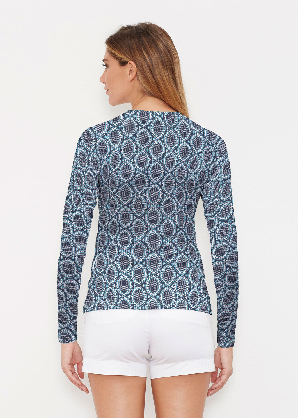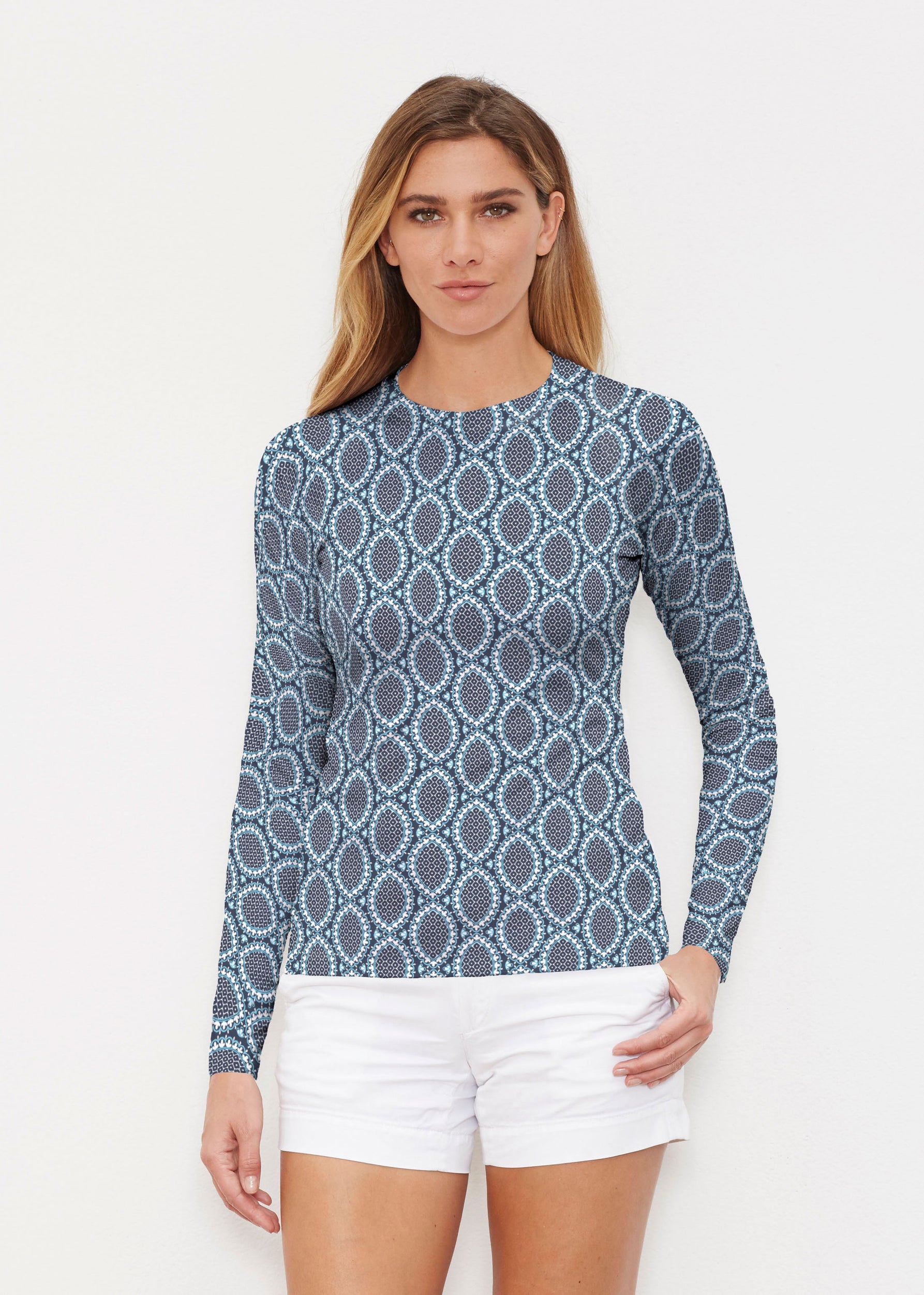 Our WHIMSY ROSE™ Safe Sun UPF 50+ long sleeve, crew neck rash guard offers versatile, beach-to-bistro style, supreme comfort, and an activewear fit. Made in a specially designed Safe Sun textile that blocks more harmful rays and provides a smart solution for those who love to swim, surf, kayak, canoe, waterski, boat, or simply relax waterside.