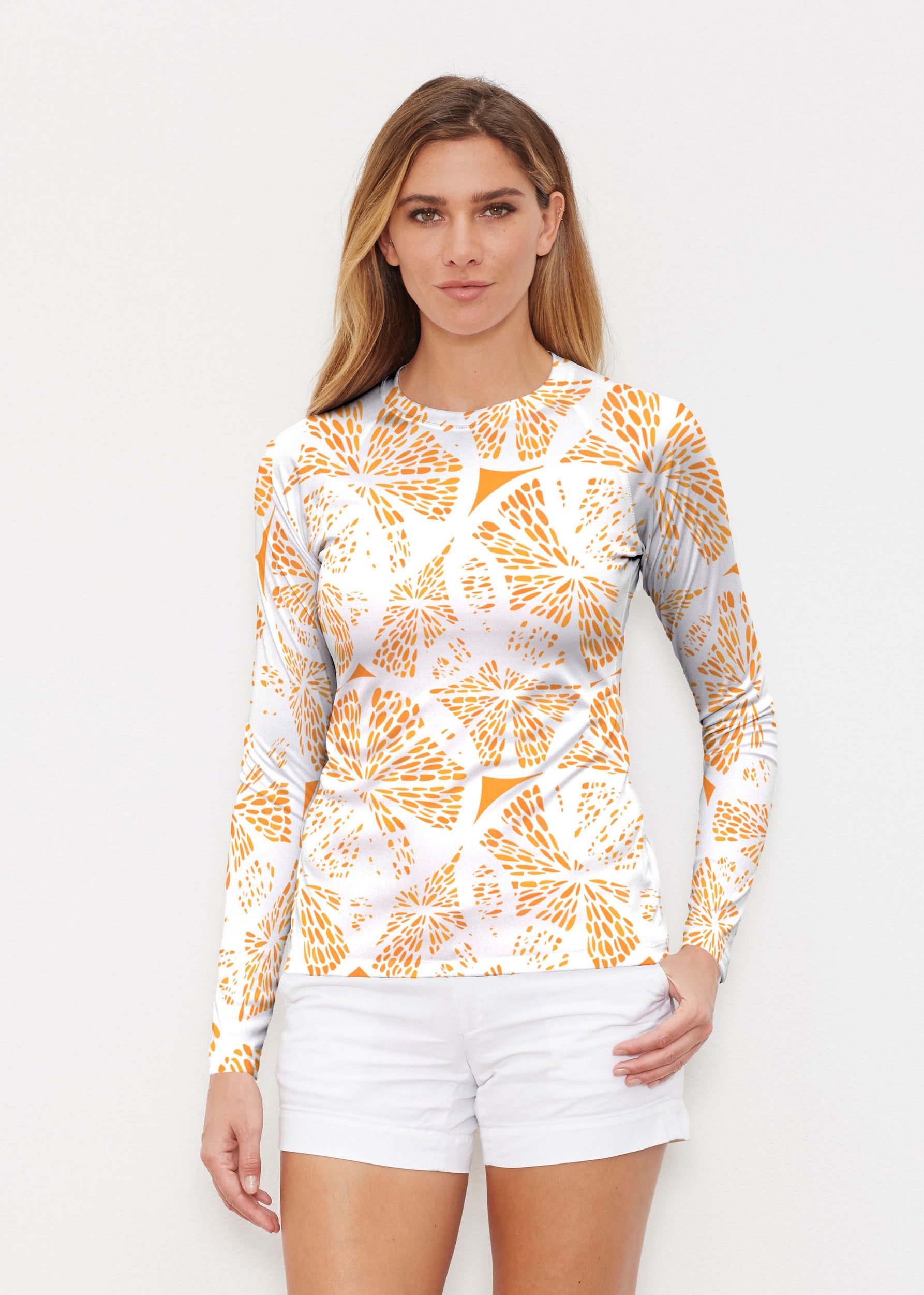 Our WHIMSY ROSE™ Safe Sun UPF 50+ long sleeve, crew neck rash guard offers versatile, beach-to-bistro style, supreme comfort, and an activewear fit. Made in a specially designed Safe Sun textile that blocks more harmful rays and provides a smart solution for those who love to swim, surf, kayak, canoe, waterski, boat, or simply relax waterside.