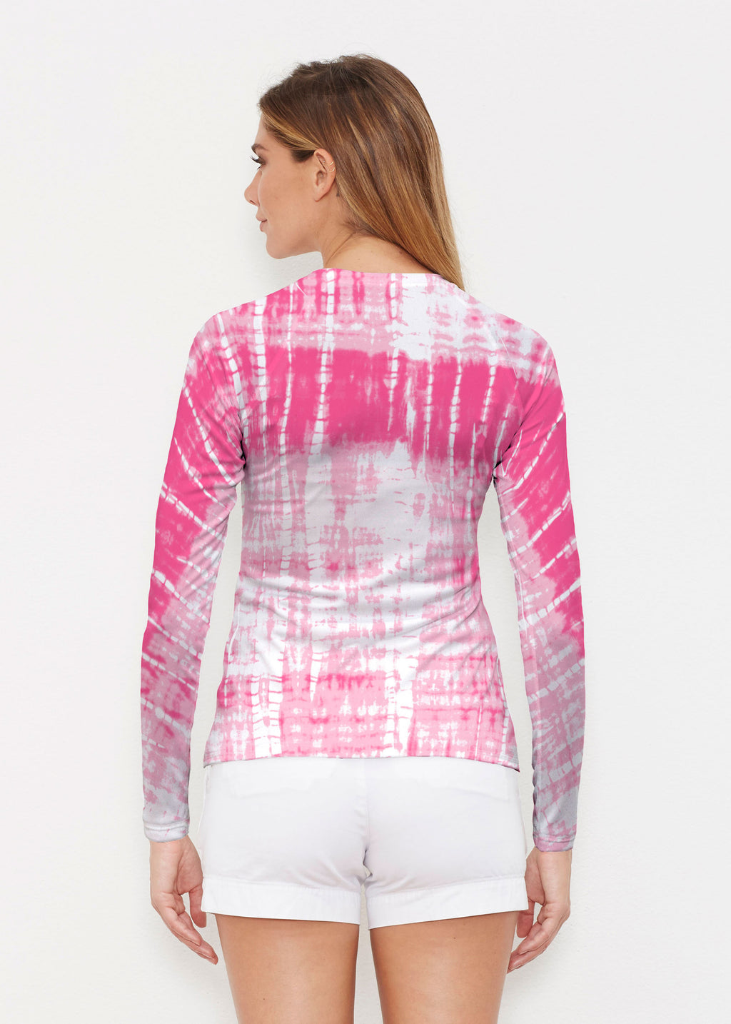 Our WHIMSY ROSE™ Safe Sun UPF 50+ long sleeve, crew neck rash guard offers versatile, beach-to-bistro style, supreme comfort, and an activewear fit. Made in a specially designed Safe Sun textile that blocks more harmful rays and provides a smart solution for those who love to swim, surf, kayak, canoe, waterski, boat, or simply relax waterside.