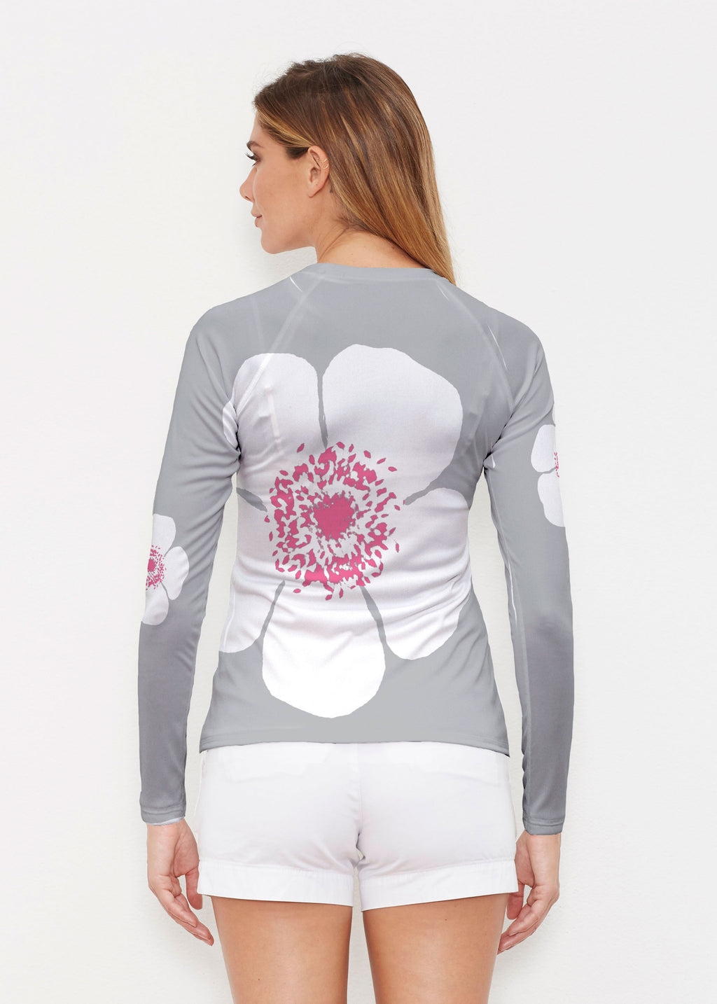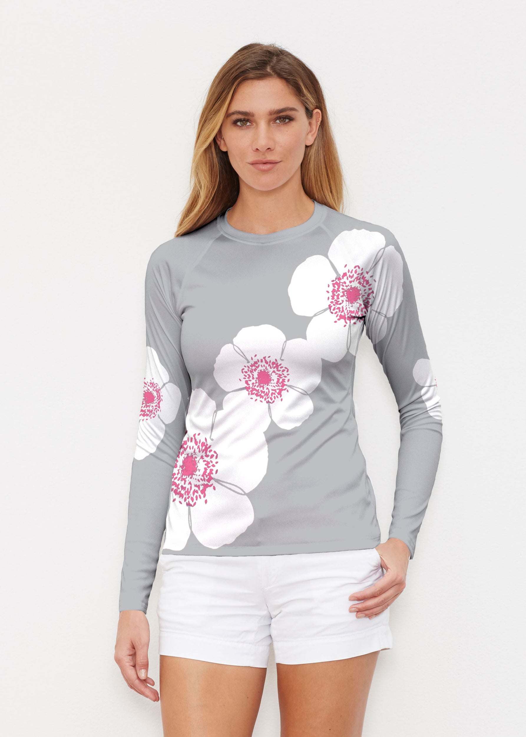 Our WHIMSY ROSE™ Safe Sun UPF 50+ long sleeve, crew neck rash guard offers versatile, beach-to-bistro style, supreme comfort, and an activewear fit. Made in a specially designed Safe Sun textile that blocks more harmful rays and provides a smart solution for those who love to swim, surf, kayak, canoe, waterski, boat, or simply relax waterside.