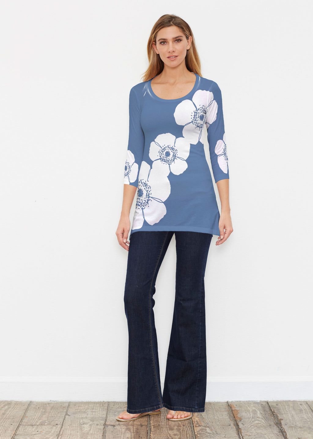 Surprising comfort and style combine in our luxurious Buttersoft blend. A delicate scoop neck, 3/4 sleeve, sweeping curved hemline falls just below the hip.