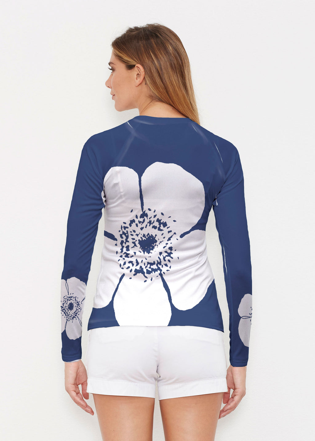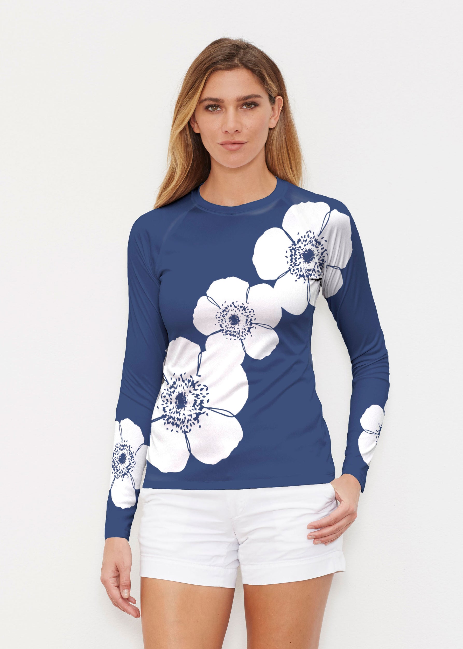 Our WHIMSY ROSE™ Safe Sun UPF 50+ long sleeve, crew neck rash guard offers versatile, beach-to-bistro style, supreme comfort, and an activewear fit. Made in a specially designed Safe Sun textile that blocks more harmful rays and provides a smart solution for those who love to swim, surf, kayak, canoe, waterski, boat, or simply relax waterside.