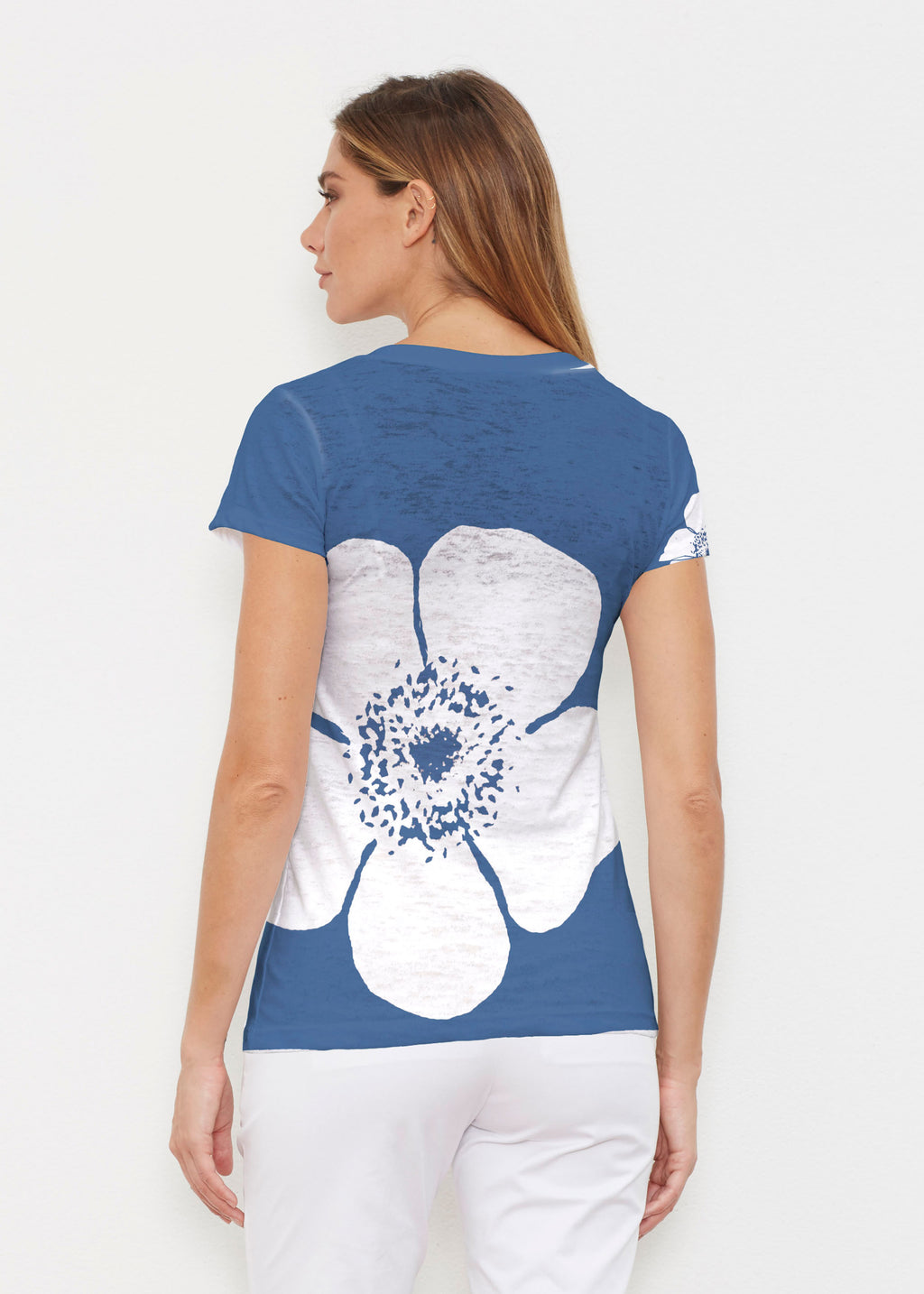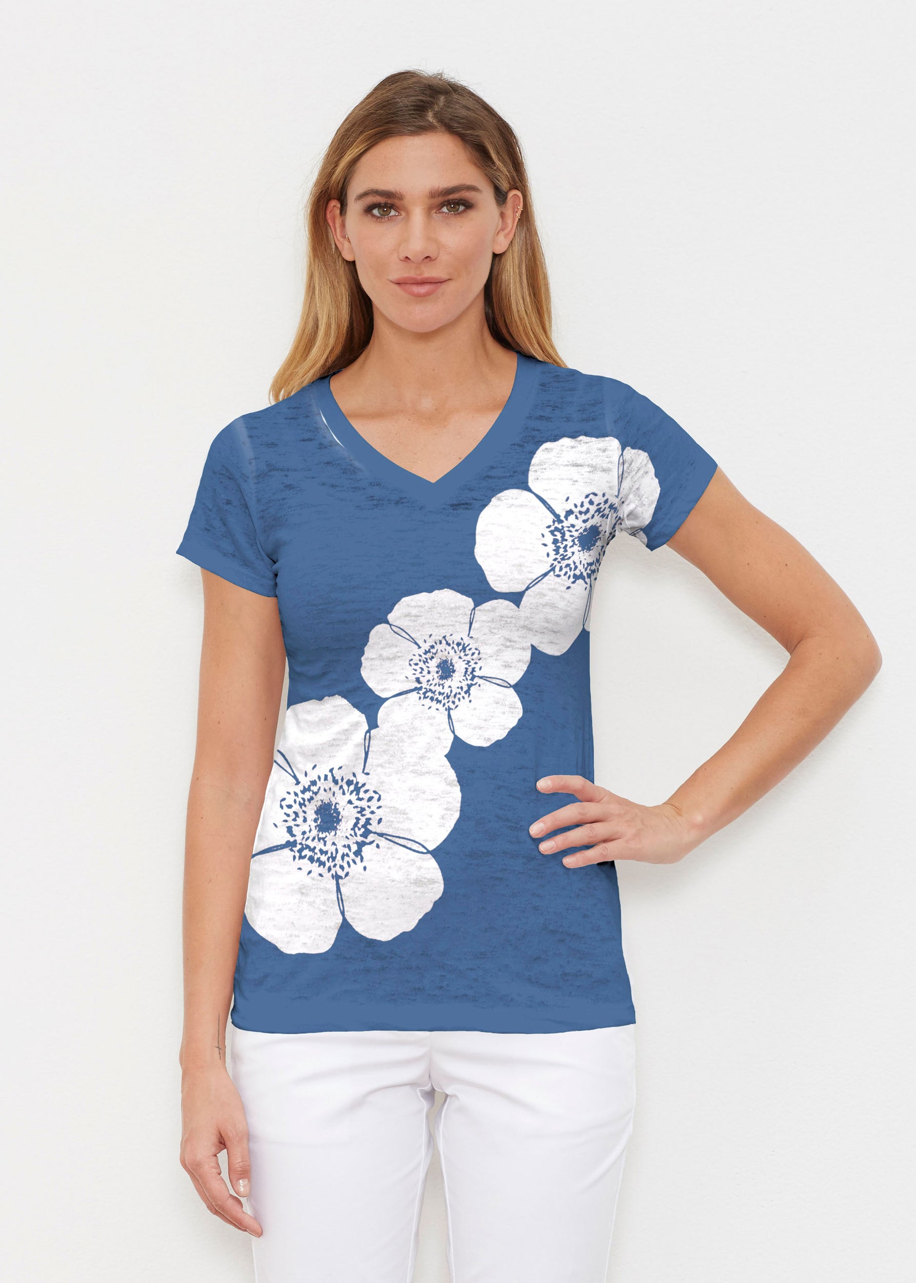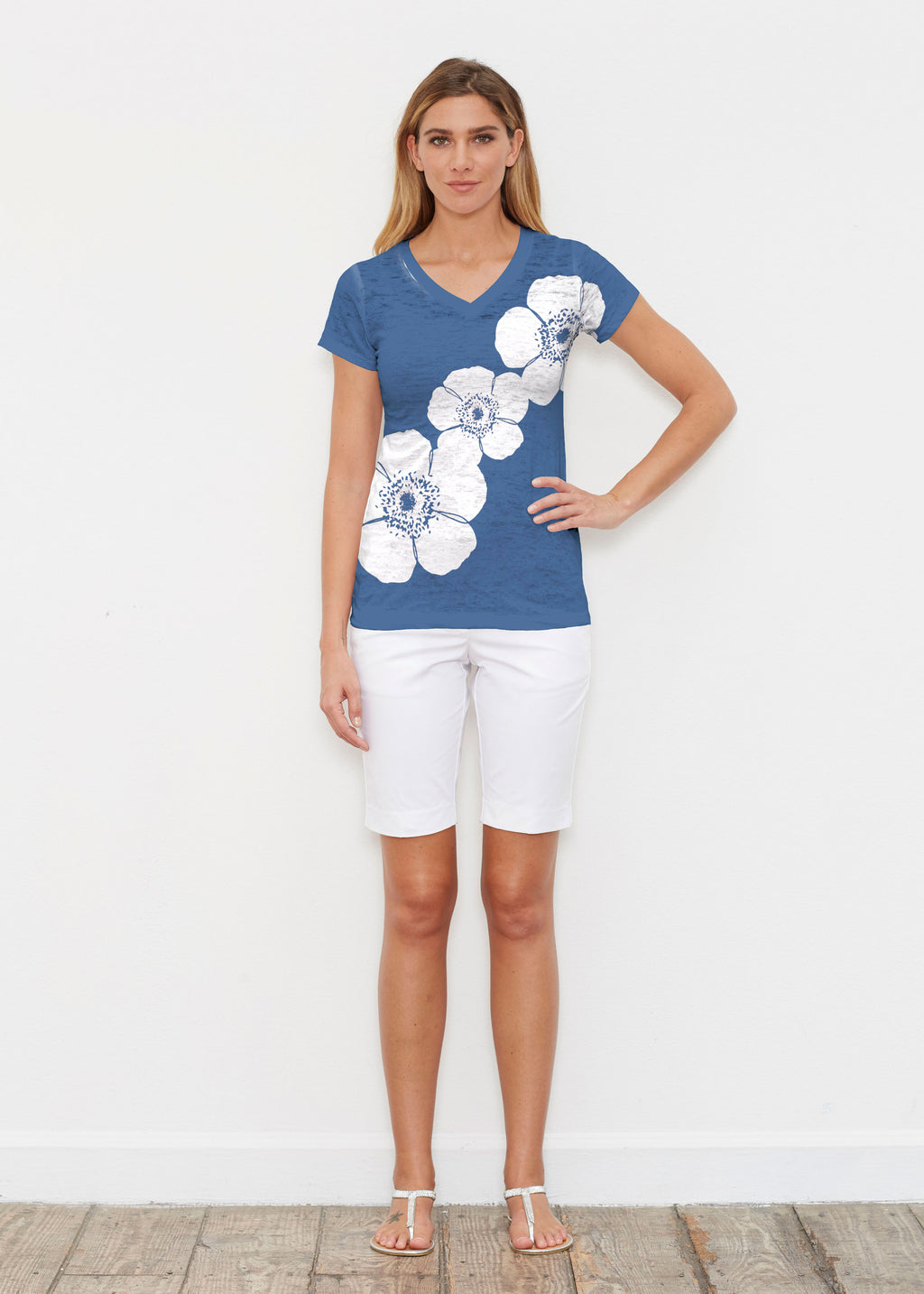 Created in soft, casual burn-out Signature blend, this tee features a subtle v-neck and cap sleeves.
