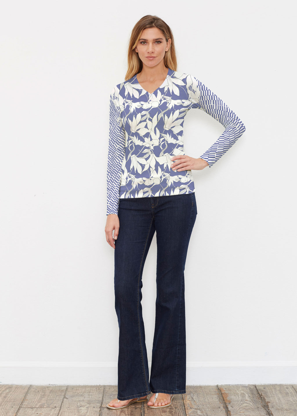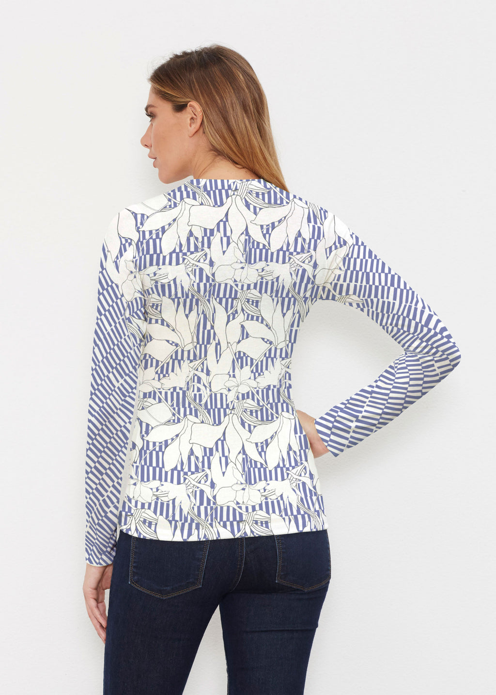 A gorgeous combination of penned florals on a solid navy front and abstract blocks on the back and sleeves designed by Susan Werner.