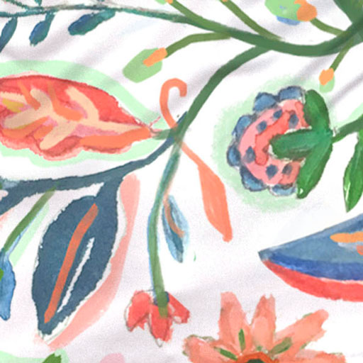 A stunning and playful floral print in coral, aqua, blue and green, designed by Jeanetta Gonzales.