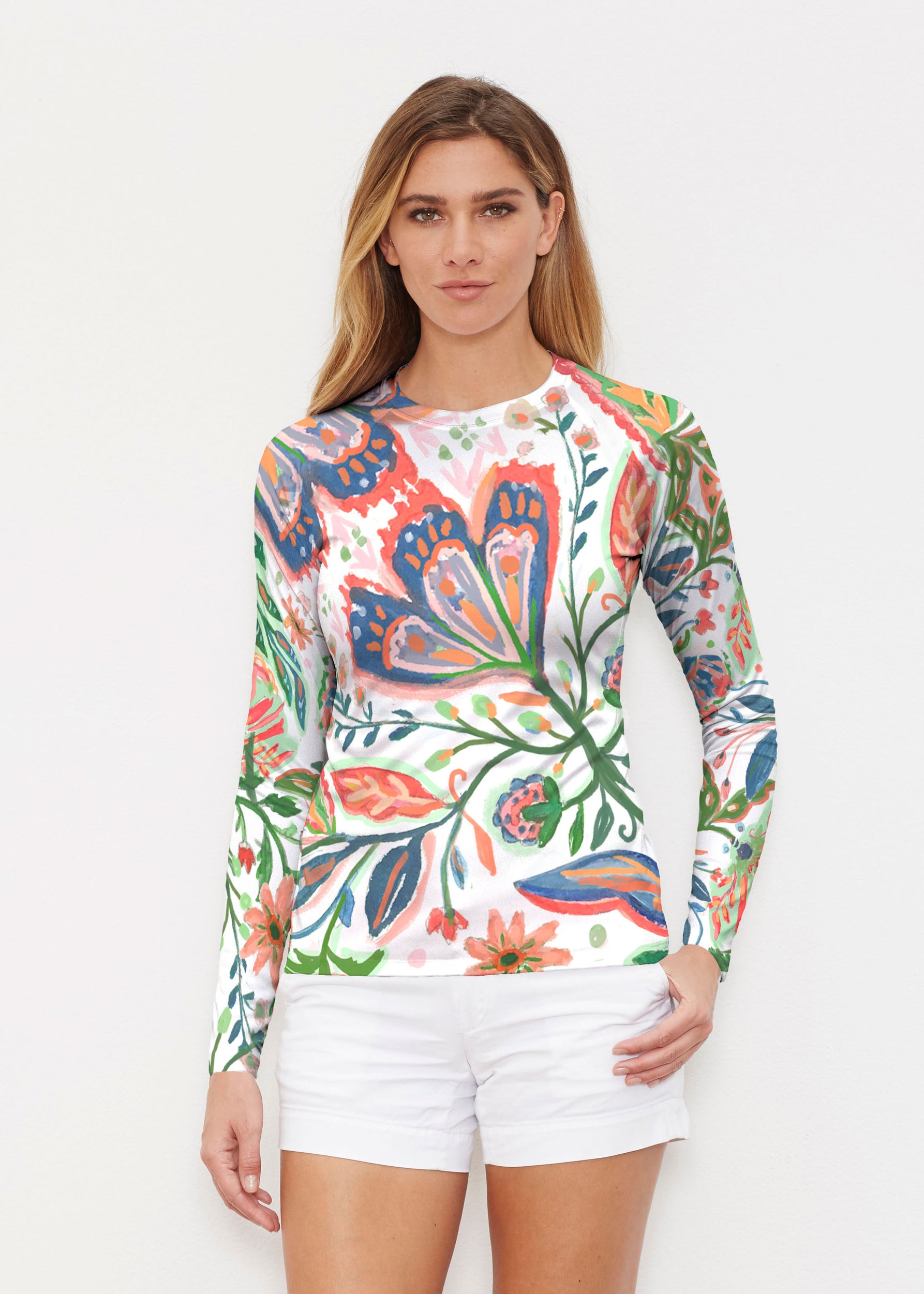 Our WHIMSY ROSE™ Safe Sun UPF 50+ long sleeve, crew neck rash guard offers versatile, beach-to-bistro style, supreme comfort, and an activewear fit. Made in a specially designed Safe Sun textile that blocks more harmful rays and provides a smart solution for those who love to swim, surf, kayak, canoe, waterski, boat, or simply relax waterside.