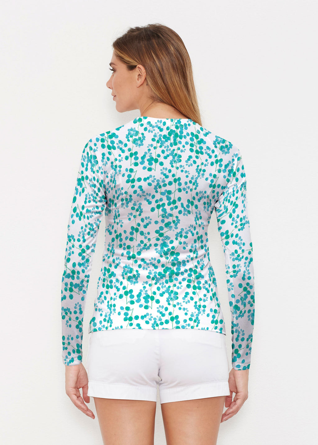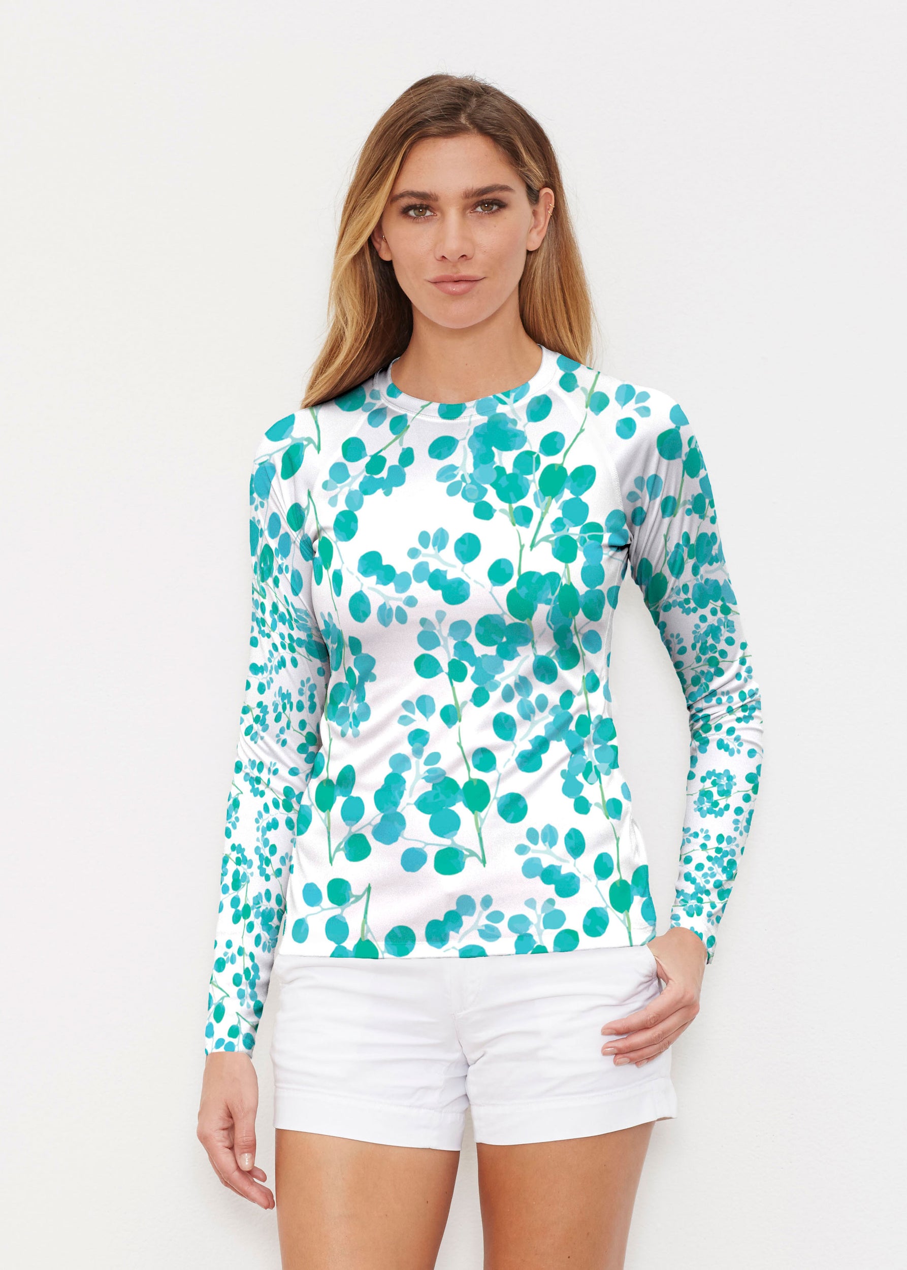 Our WHIMSY ROSE™ Safe Sun UPF 50+ long sleeve, crew neck rash guard offers versatile, beach-to-bistro style, supreme comfort, and an activewear fit. Made in a specially designed Safe Sun textile that blocks more harmful rays and provides a smart solution for those who love to swim, surf, kayak, canoe, waterski, boat, or simply relax waterside.